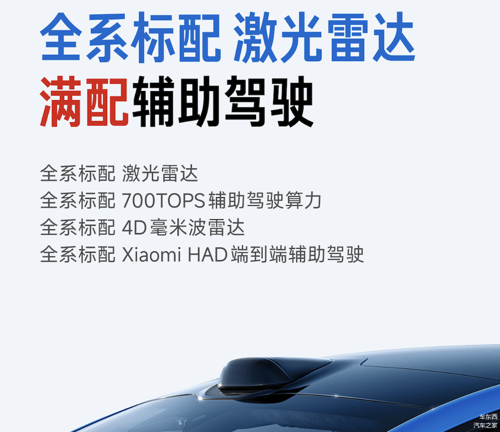 此次改款升级点主要体现在 底盘、续航、安全、智能辅助驾驶等核心维度,包括全系标配激光雷达、700TOPS辅助驾驶算力、Xiaomi HAD端到端辅助驾驶等。