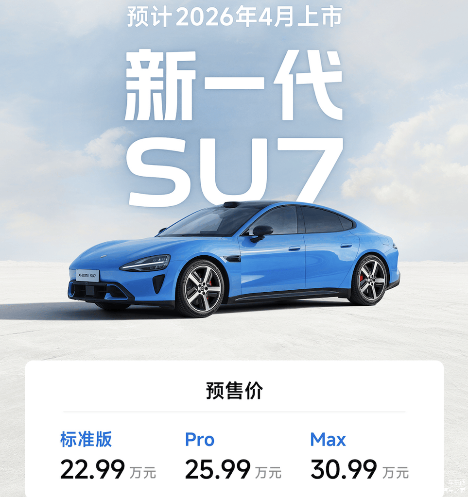 车东西1月7日消息,就在刚刚,雷军正式官宣,新一代小米SU7开启小订,预售22.99万元起, 预计将于2026年4月正式上市,小订意向金1000元上市后可退。