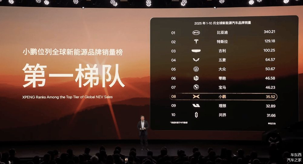 根据官方数据,从2025年前十个月全球新能源汽车品牌销量TOP10来看,小鹏排在第八位,超过了理想和问界。
