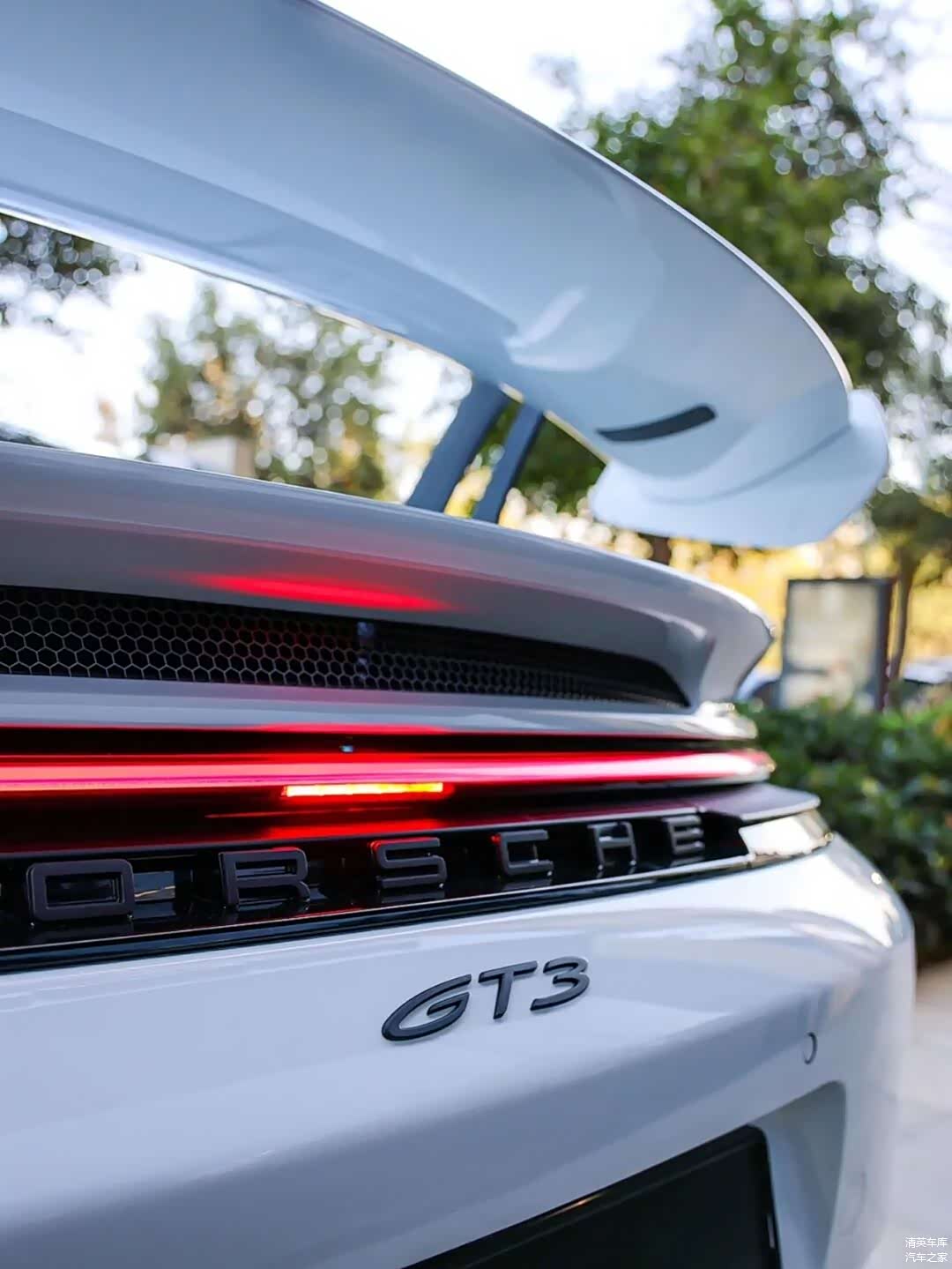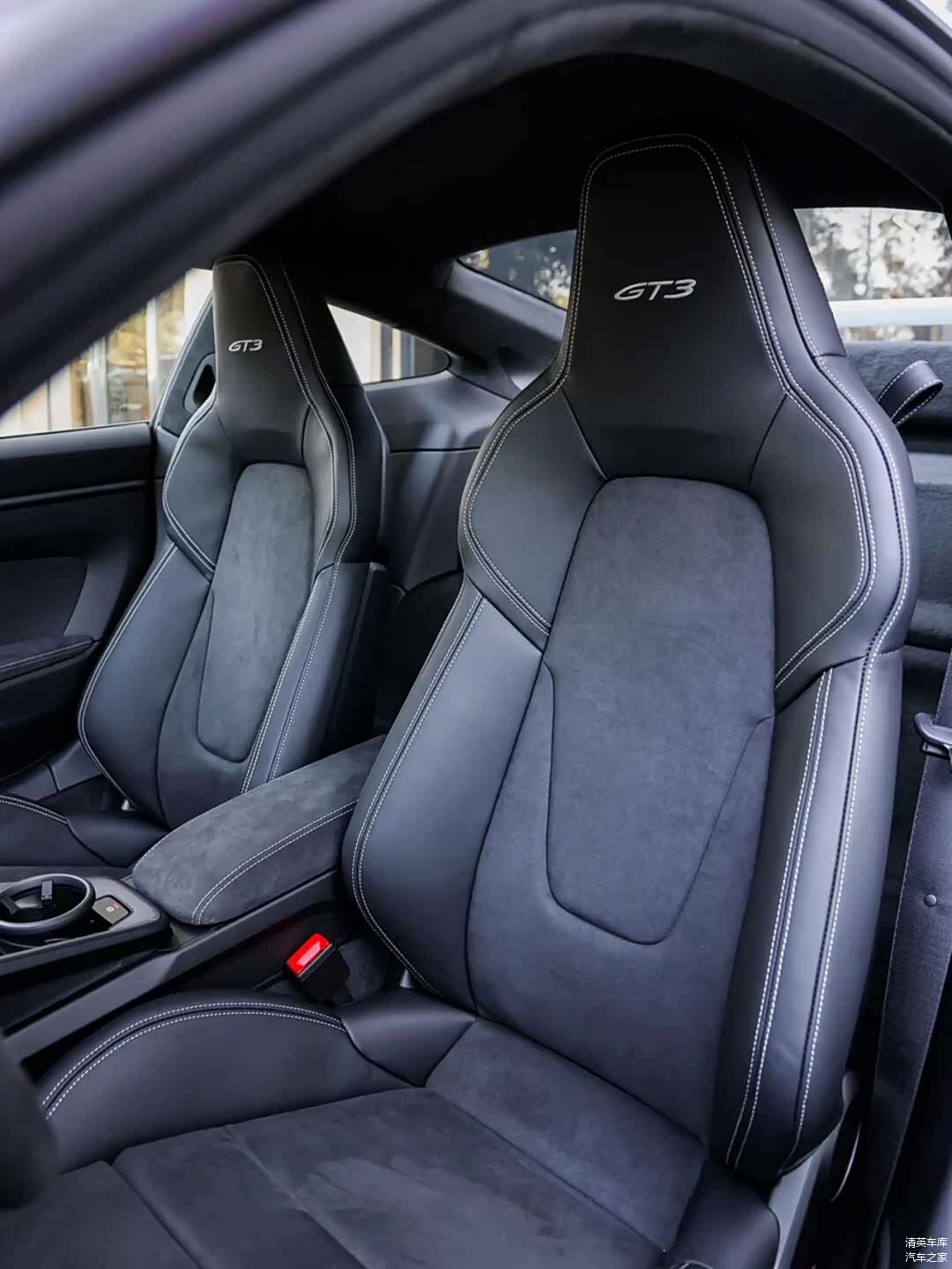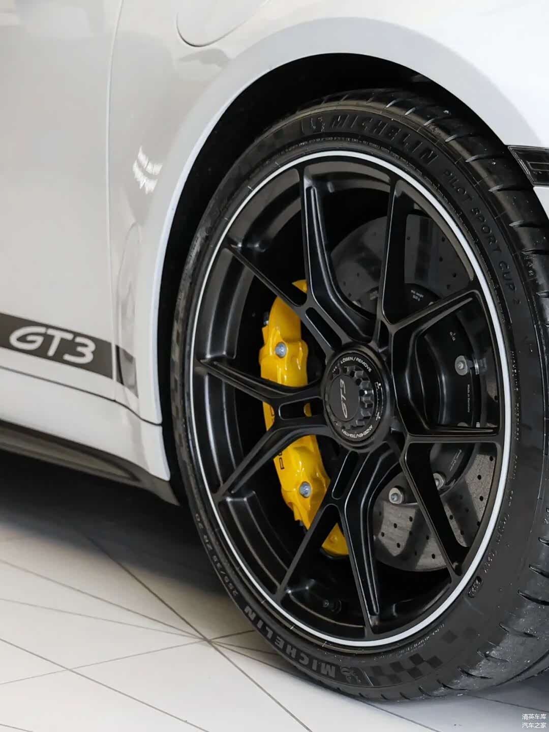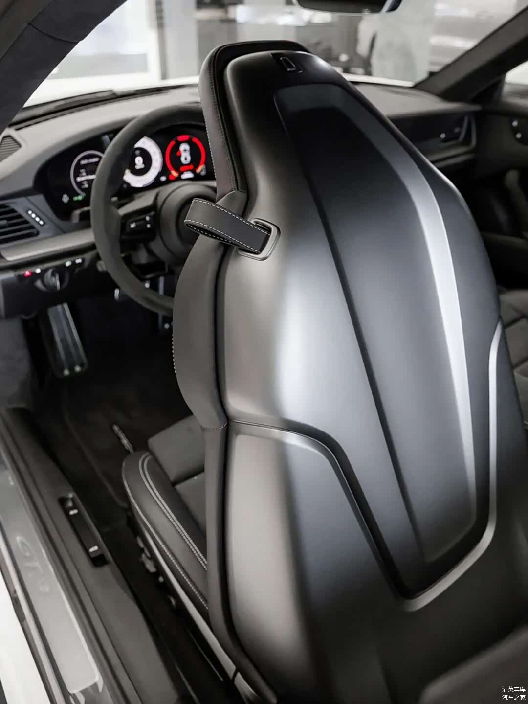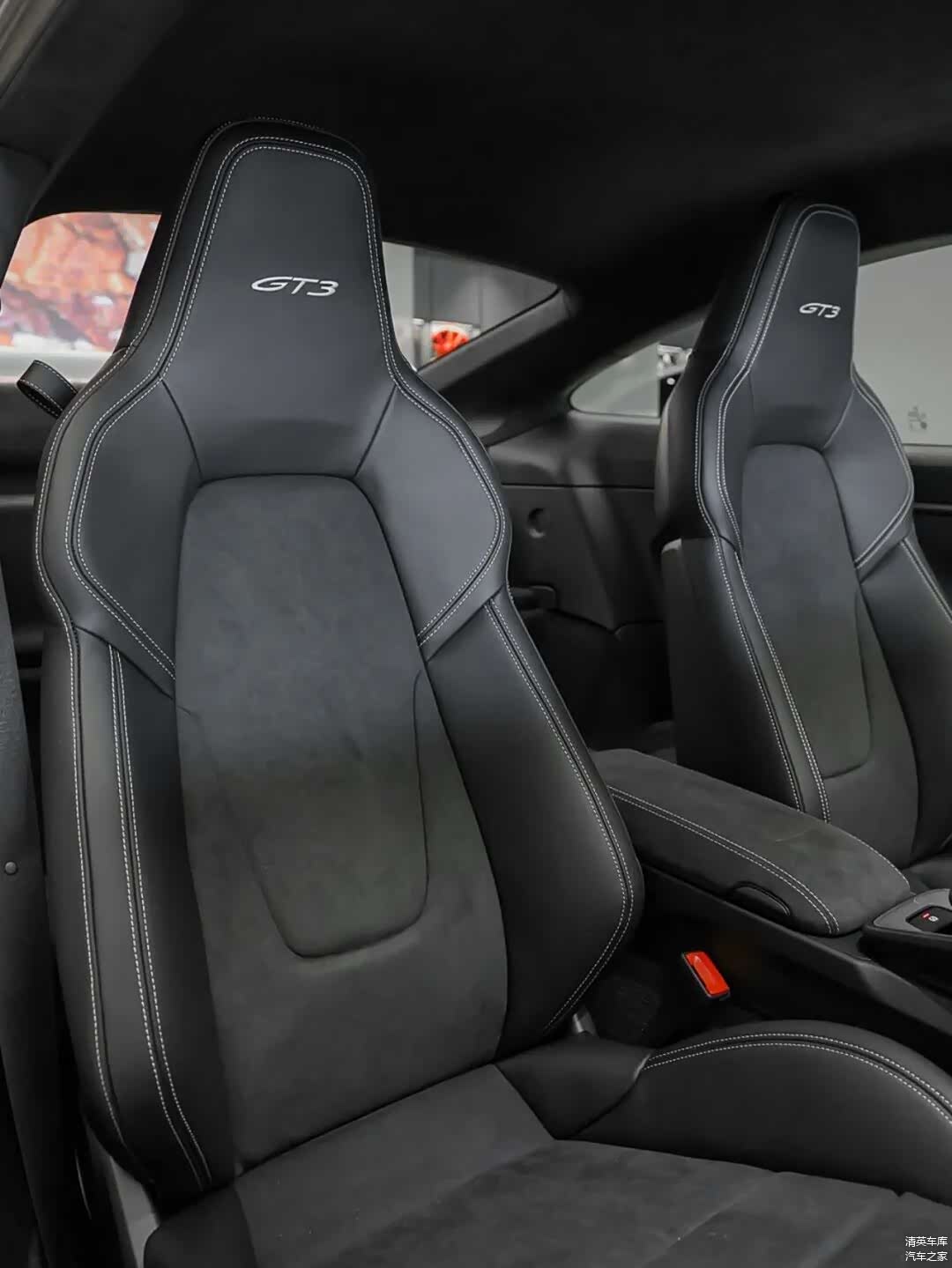以这台白色保时捷911 GT3为例,主要配置包括:黑色侧边车型徽标,黑内饰搭配GT银色对比缝线,采用皮革/Race-Tex复合材料,20/21英寸911 GT3锻造铝合金轻量化轮毂,自适应运动型座椅升级版(18向电动调节),前裙板扰流鳍片与车身同色涂装,前桥举升系统,保时捷陶瓷复合制动系统(PCCB),独家设计尾灯组,后部停车辅助系统,白外黑内的配色挺不错,不过没有选这款碳纤维桶椅,看着还是略差点意思。