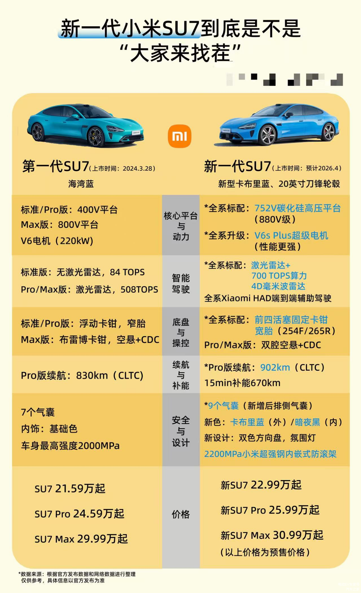 小米SU7此次改款,则是一次“加量”显著的全面进化。相比现款,新款在核心维度数据提升明显:安全方面,采用2200MPa超强钢内嵌式防滚架(老款为2000MPa),气囊数从7个增至9个。