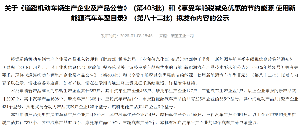 ▲工信部发布第403批《道路机动车辆生产企业及产品公告》