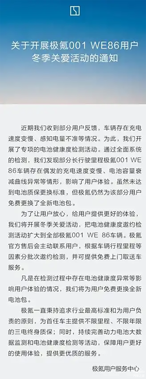 极氪汽车曾经推出001 WE86冬季关爱活动,为全部极氪001 WE86车型免费更换电池包;虽然极氪方面没有说明相关车辆电池品牌,但多方信息均指向欣旺达所供应的电芯。