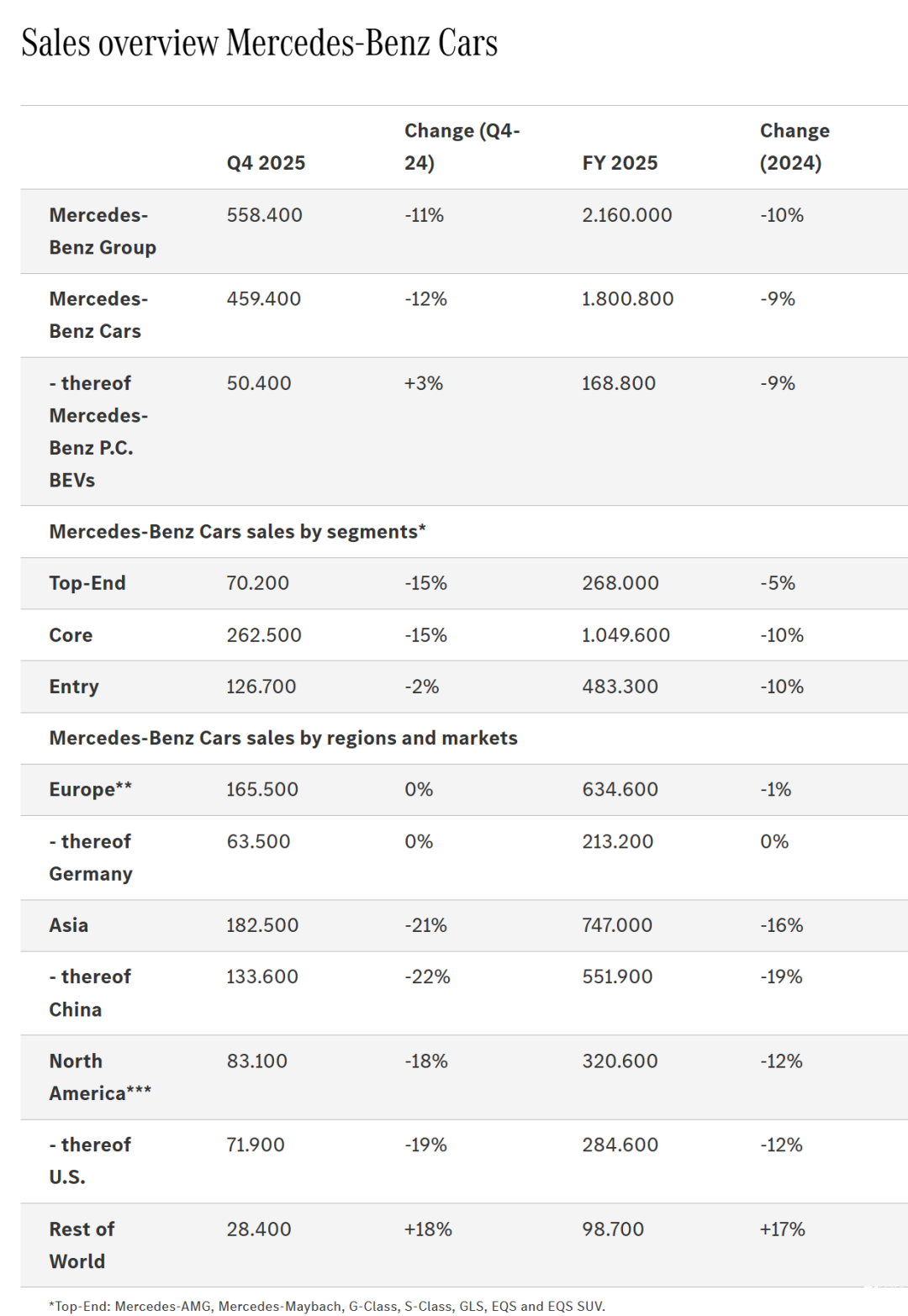 北京时间今天早上,奔驰公布 2025 全年销量数据。其中中国区 2025 全年销量 55.19 万台,同比下降 19%,略大于奔驰主力豪华市场所在的大盘跌幅。