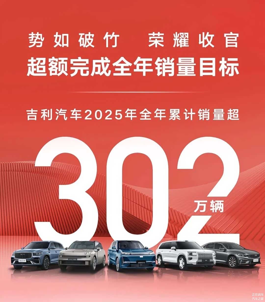 2025年,吉利汽车累计销量突破302万台,同比增长39%。