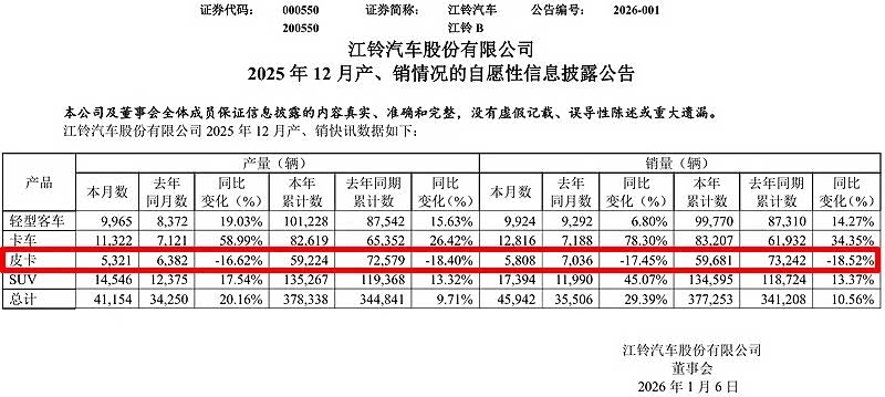 不过,从江铃汽车发布的数据报告中也能够看到,江铃汽车包括轻型客车、卡车、SUV都实现了不同程度的增长,唯独皮卡车型,在12月份以及全年均实现了同比下滑。