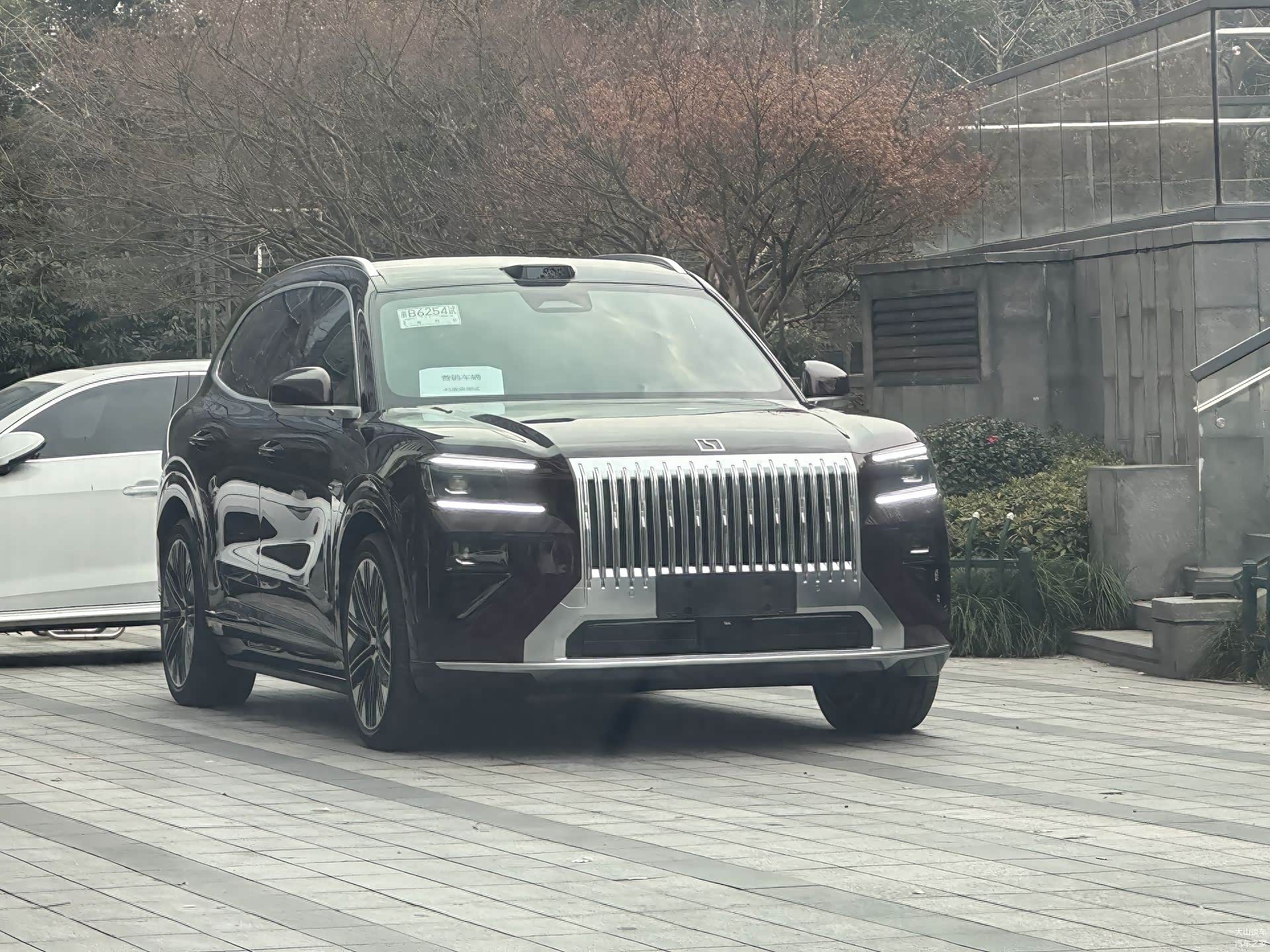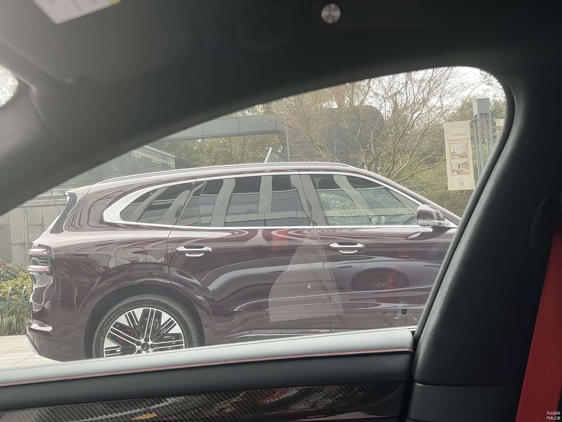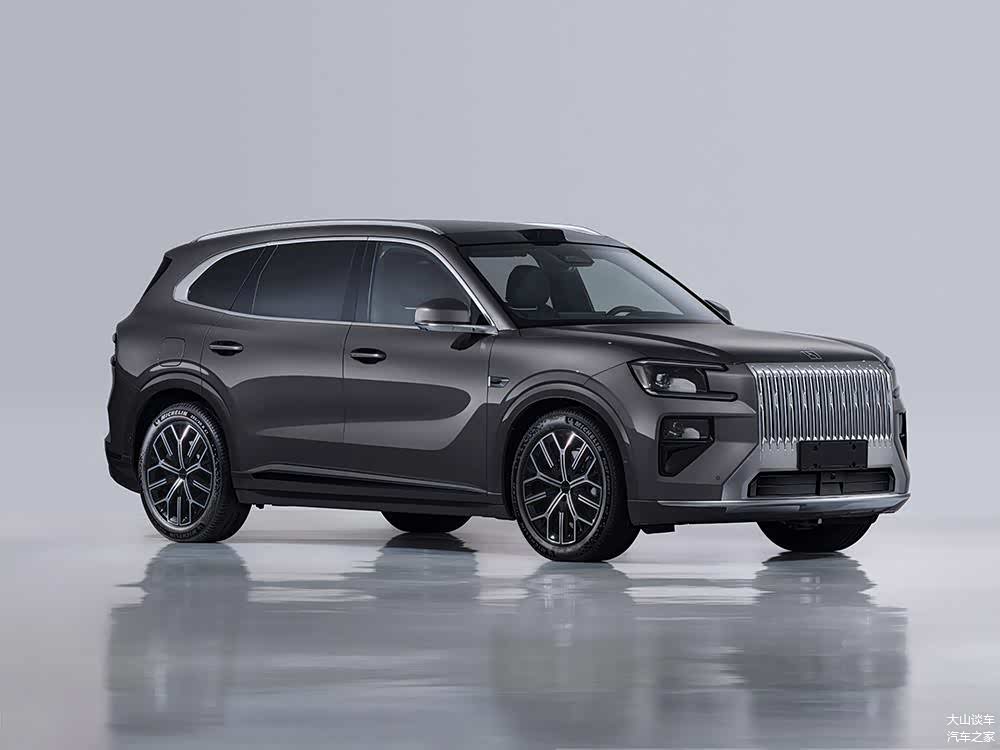 三围数据挺亮眼:长宽高分别是5100/1998/1780mm,轴距达到了3069mm。虽然比自家的9X小一圈,但放在同级里,它比问界M7、理想L8甚至宝马X5都要大。实车看起来确实体量感十足,线条饱满有力,很有肌肉感。细节上也很用心,车窗边框、门把手这些地方都用上了镀铬装饰,搭配曝光的这种暗红色车漆,高级感营造得不错。轮毂给了20到22英寸多种选择,还配了醒目的橙色刹车卡钳,电动踏板也应该会安排上,方便上下车。