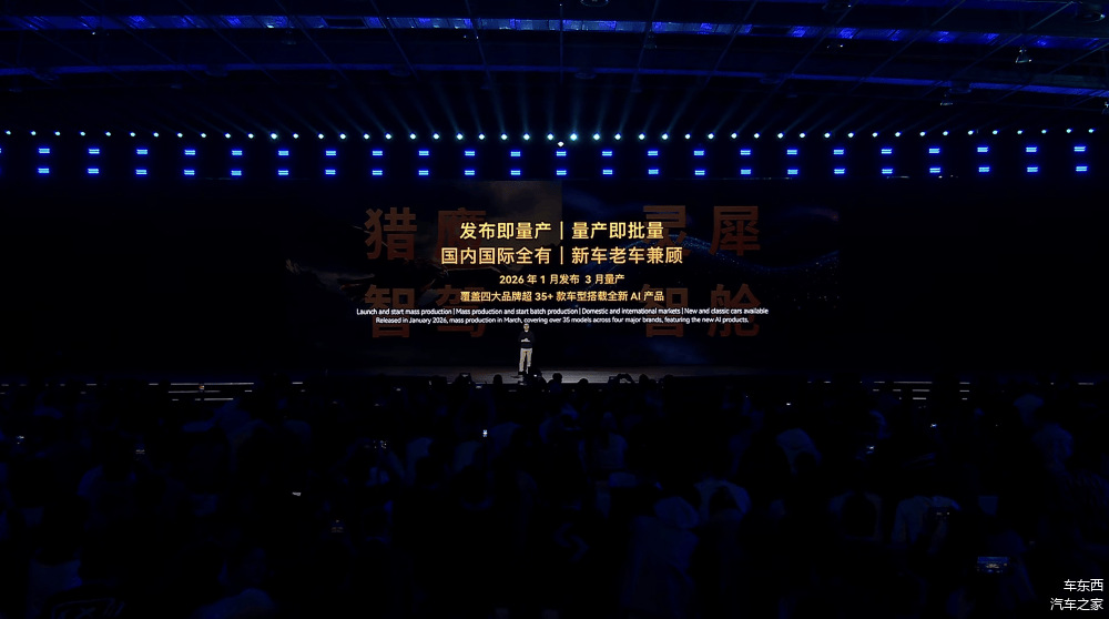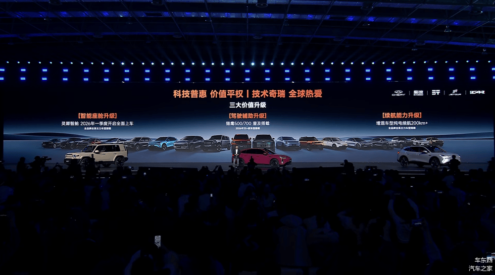 同时,奇瑞正式公布“智能座舱升级”“驾驶辅助升级”和“续航能力升级”三大升级计划,其中灵犀智舱计划在2026年一季度实现全品牌全系主力车型全面上车;猎鹰智驾在2026年将有超35款车型搭载;增混车型则均要实现200km+的纯电续航。