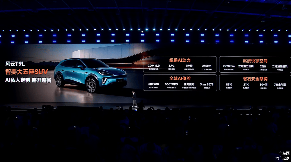 其中大五座SUV风云T9L继广州车展正式亮相后开启盲订,车辆搭载鲲鹏AI超能电混 CDM 6.0和猎鹰700,支持鲲鹏AI能量管理,并且支持AI私人定制,打造独特的驾乘体验。