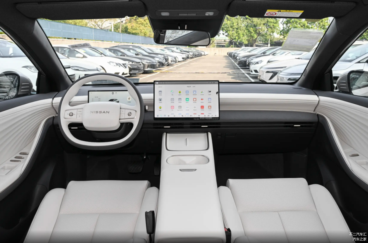坐进车内,日产N6的内饰布局同样属于简约清新的风格,并且全系标配10.25英寸全液晶仪表以及2.5K分辨率的中控屏幕。不过,日产N6的低配和中配车型的中控屏尺寸为14.6英寸,高配和顶配升级为15.6英寸。与此同时,高配车型还采用了算力更高的骁龙8775车机芯片,中低配车型为骁龙8155芯片。