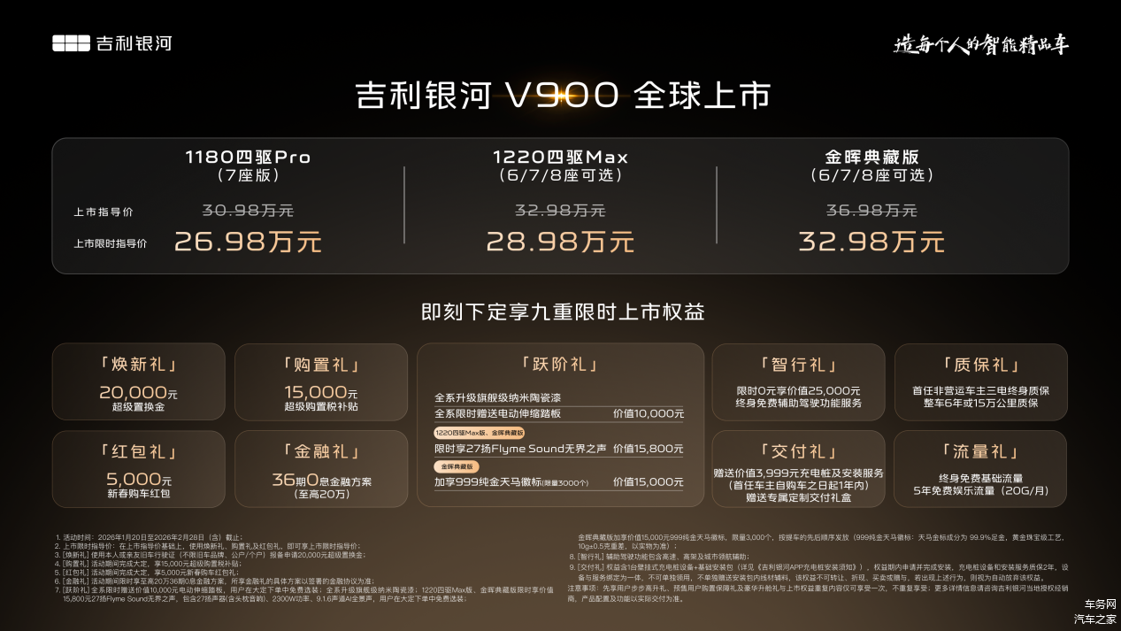 1月20日,吉利银河豪华V系列首发之作,“AI全场景家庭旗舰MPV”——吉利银河V900正式上市,共推出3个车型,上市限时指导价26.98万元-32.98万元。即日起,用户可通过吉利银河APP、微信小程序、抖音小程序及官网等官方渠道下订,下订即享焕新礼、购置礼、红包礼、金融礼、智行礼、质保礼、交付礼、流量礼、跃阶礼九重购车好礼,超高价值,一次满足,诚意拉满。