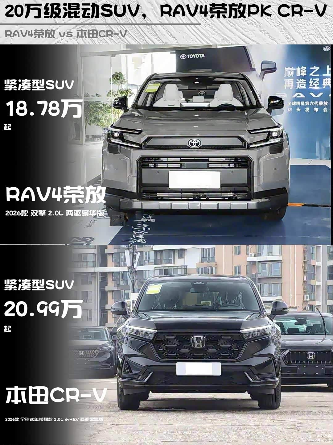 最近在选混动SUV的朋友看过来!🔥 深度对比2026款 RAV4荣放(图片 | 参数 | 询价)双擎2.0L两驱豪华版和本田CR-V 2.0L e:HEV两驱智享版,实测干货分享👇