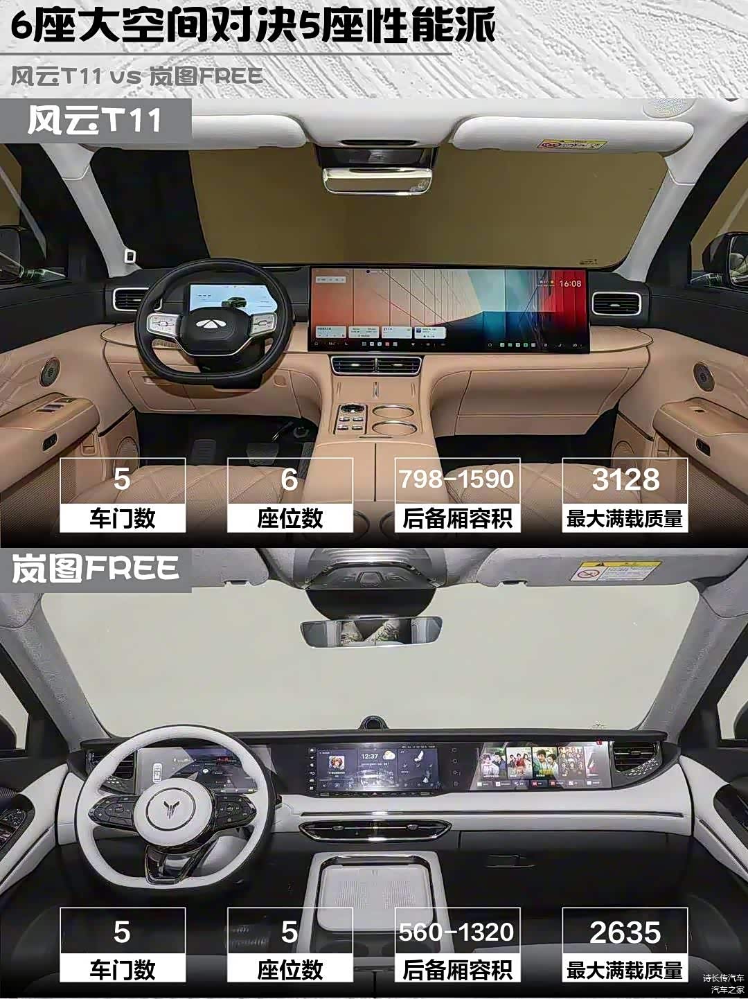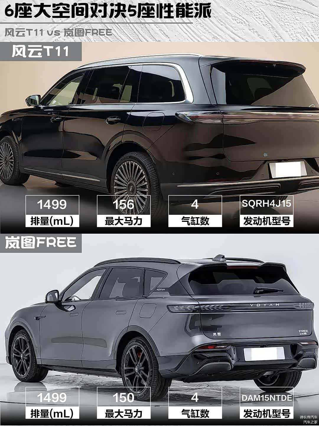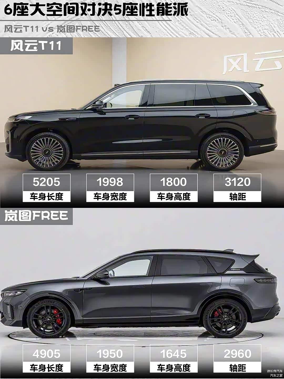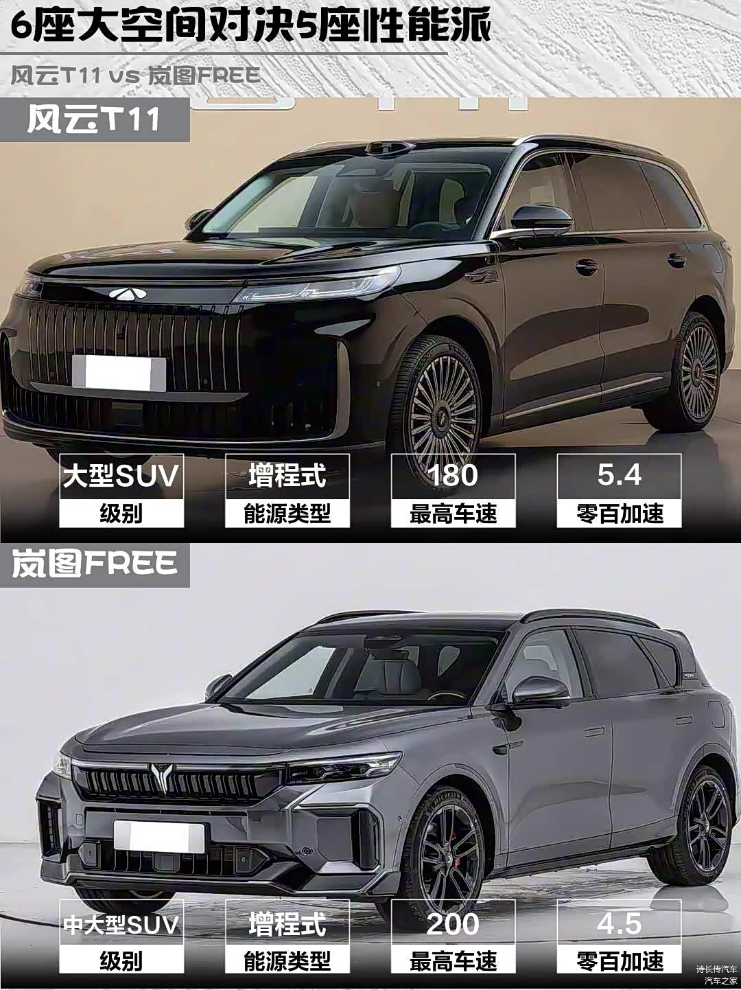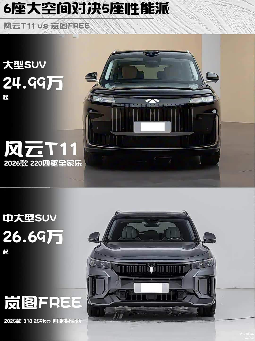 最近在选家用增程SUV的朋友看过来!今天深度对比两款热门车型——风云T11 2026款 220四驱全家乐和 岚图FREE(图片 | 参数 | 询价) 2025款 318 259km四驱探索版,实测干货分享👇
