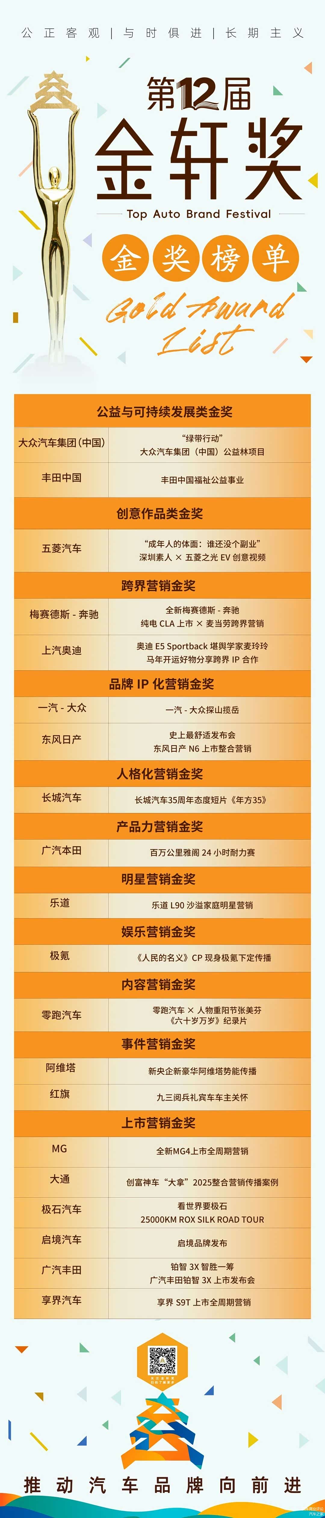 走过十二载,金轩奖始终以“公正客观、与时俱进、长期主义”为核心价值观,坚持作为中国汽车营销界的观察者、记录者,寻找那些真正深耕用户、与行业发展同频共振的营销案例。