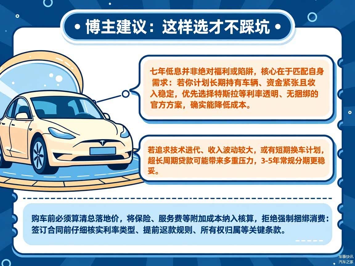 七年低息并非绝对的福利或陷阱,核心在于匹配自身需求。若你计划长期持有车辆、资金紧张且收入稳定,优先选择特斯拉等利率透明、无捆绑的官方方案,确实能降低成本;若追求技术迭代、收入波动较大,或有短期换车计划,超长周期贷款可能带来多重压力,3-5年常规分期更稳妥。