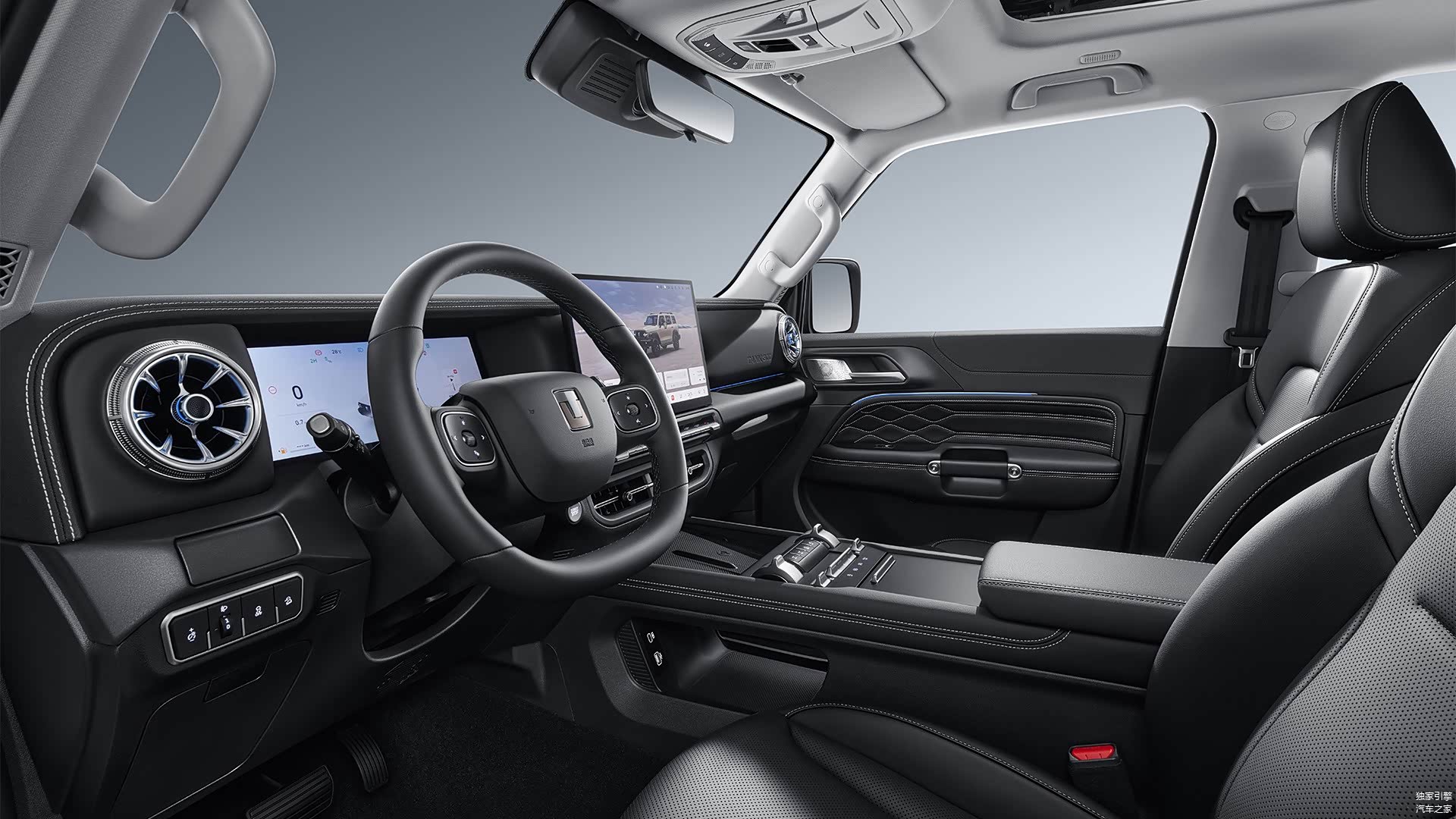 内饰和配置是两款车的“性格分水岭”,北京越野BJ40探险家主打“实用主义”,车内布局规整,15.6英寸英寸悬浮式大屏,内置8155芯片操作流畅不卡顿,能轻松应对各种复杂指令,大量实体按键的保留让驾驶者在越野过程中能更便捷地进行操作;前排座椅加热/通风都配齐了,为驾乘人员提供舒适的乘坐体验。
