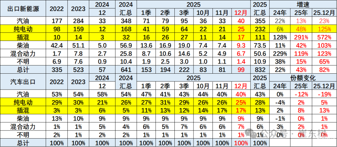 2025年全年中国汽车出口中纯电动占比28%,同比增长2%;插混占比13%,同比增长8%;混动占比6%,同比增长2%;纯燃油车占比43%,同比下降11%。