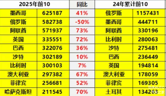 据乘联分会数据显示,墨西哥(62.5万辆)、俄罗斯(58.27万辆)、阿联酋(57.2万辆)、英国、巴西、沙特、比利时、澳大利亚、菲律宾、哈萨克斯坦成为前十大市场,合计贡献约80%的出口量,其中前五大市场占比超60%,成为增长压舱石。