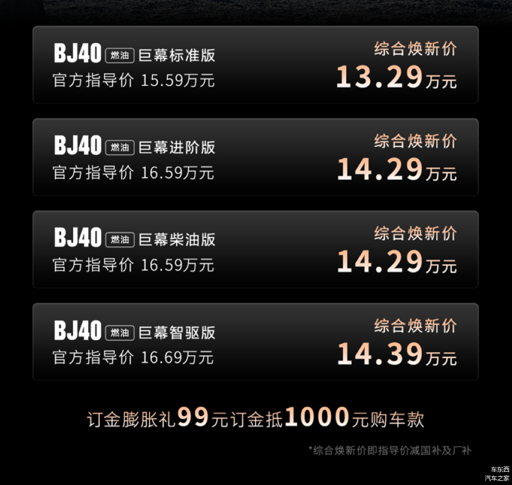 BJ40燃油巨幕版官方指导价15.59-16.69万元,综合焕新价低至13.29万元,同时拥有订金膨胀礼:1月27日下订,即可享受“99元订金抵1000元购车款”优惠政策。