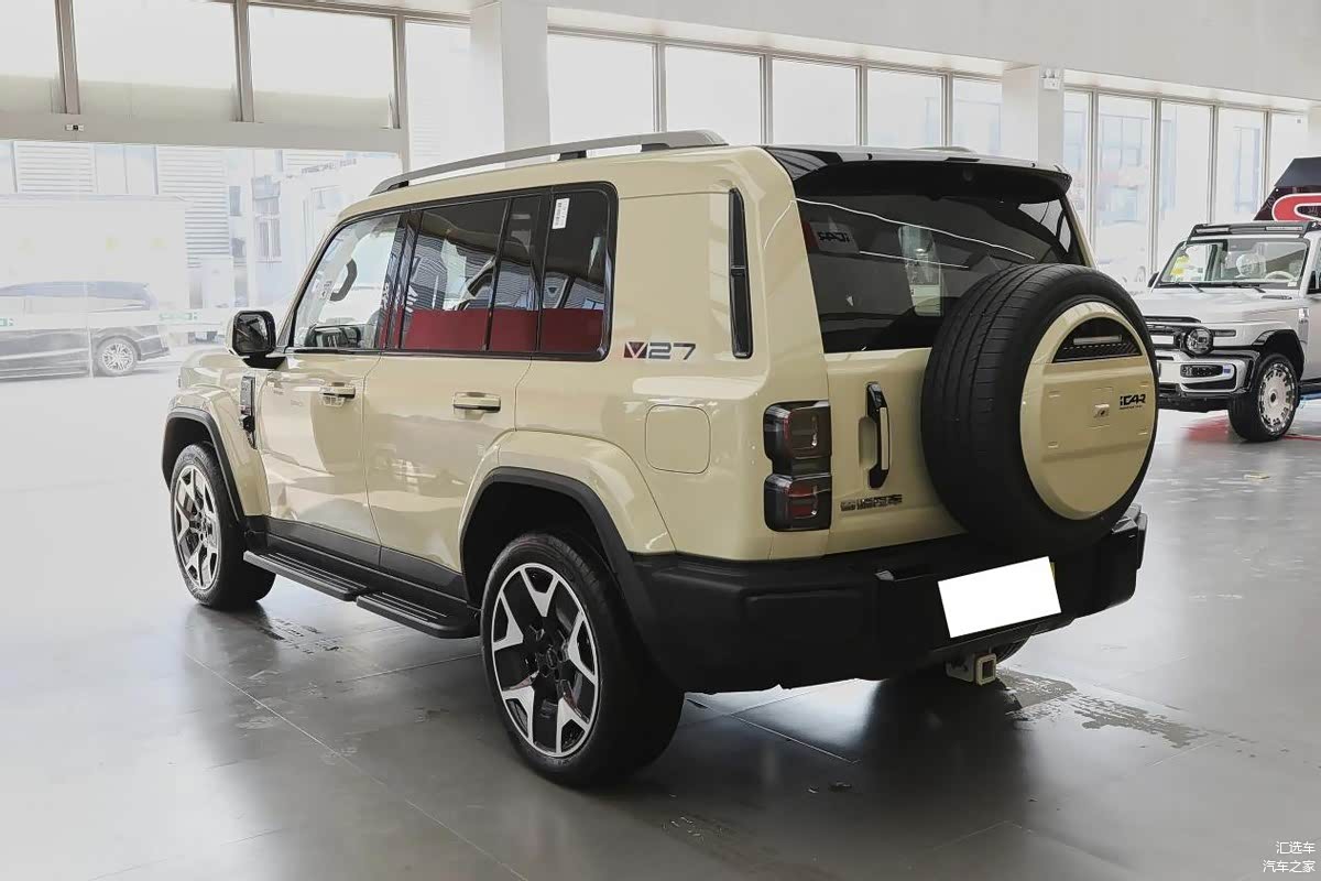 侧面来看,iCAR V27采用了横平竖直的线条勾勒,营造出了标志性的方盒子结构,车顶行李架、前后突出的轮眉、脚踏板、传统外置式门把手等设计,则进一步增添了它的硬派复古感。尺寸方面,据悉iCAR V27的长宽高分别为:5055/1976/1894mm,轴距为2910mm,属于中大型SUV定位,个头大小和方程豹钛7差不多。