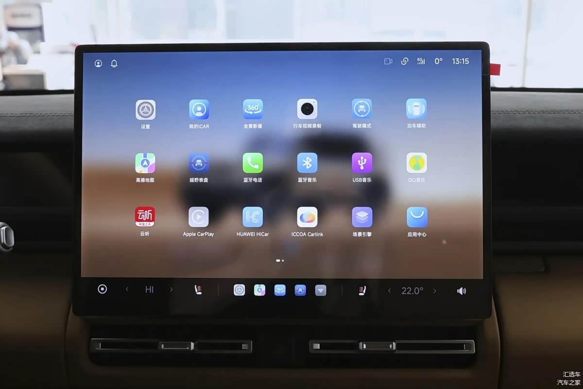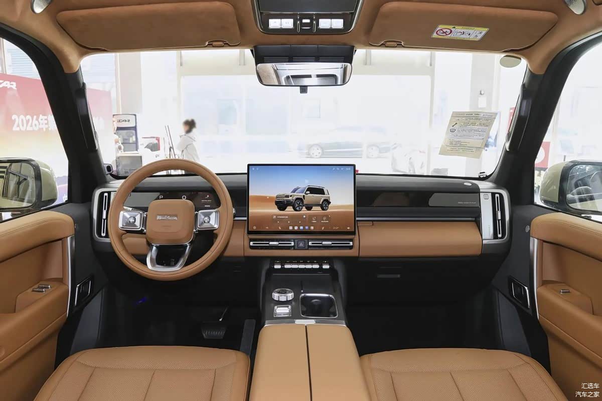 然后是内饰部分,通过实拍图能够看到,iCAR V27车内采用了硬派+科技风的组合,前排座舱中部配备了很显眼的一块悬浮式中控大屏,下方还保留了实体按键,来方便驾驶员盲操,加上大量软包材质、镀铬饰板装饰,营造出了较为规整时尚的驾乘氛围。
