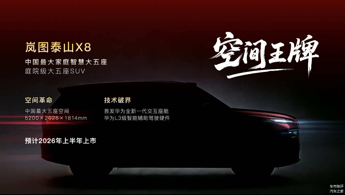 1月28日,岚图汽车重磅发布2026年产品计划,宣布将推出四款全新车型,包括中国首款量产L3级SUV岚图泰山Ultra、“庭院级大五座SUV”岚图泰山X8,代号为“FE”的全新FUV,以及代号为“珠峰”的“50万级行业最强”MPV。其中,岚图泰山X8将于2026年上半年上市。该车将搭载问界M9同款四激光雷达,首发华为全新一代交互座舱,同时还拥有独一无二的巨大空间,彰显了岚图汽车在智能化、高端化上的坚定决心。
