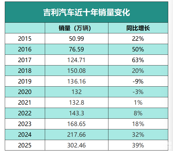 在刚刚过去不久的2025年,吉利控股交出了一份极为亮眼的成绩单:全年总销量411.6万辆,同比增长26%,全球排名第七,也是前十汽车集团中增速最快的企业。作为吉利控股旗下的核心子公司,吉利汽车以39%的增幅超额完成300万辆年度销量目标,比2024年足足增加84.8万辆,为吉利控股创新高立下汗马功劳。