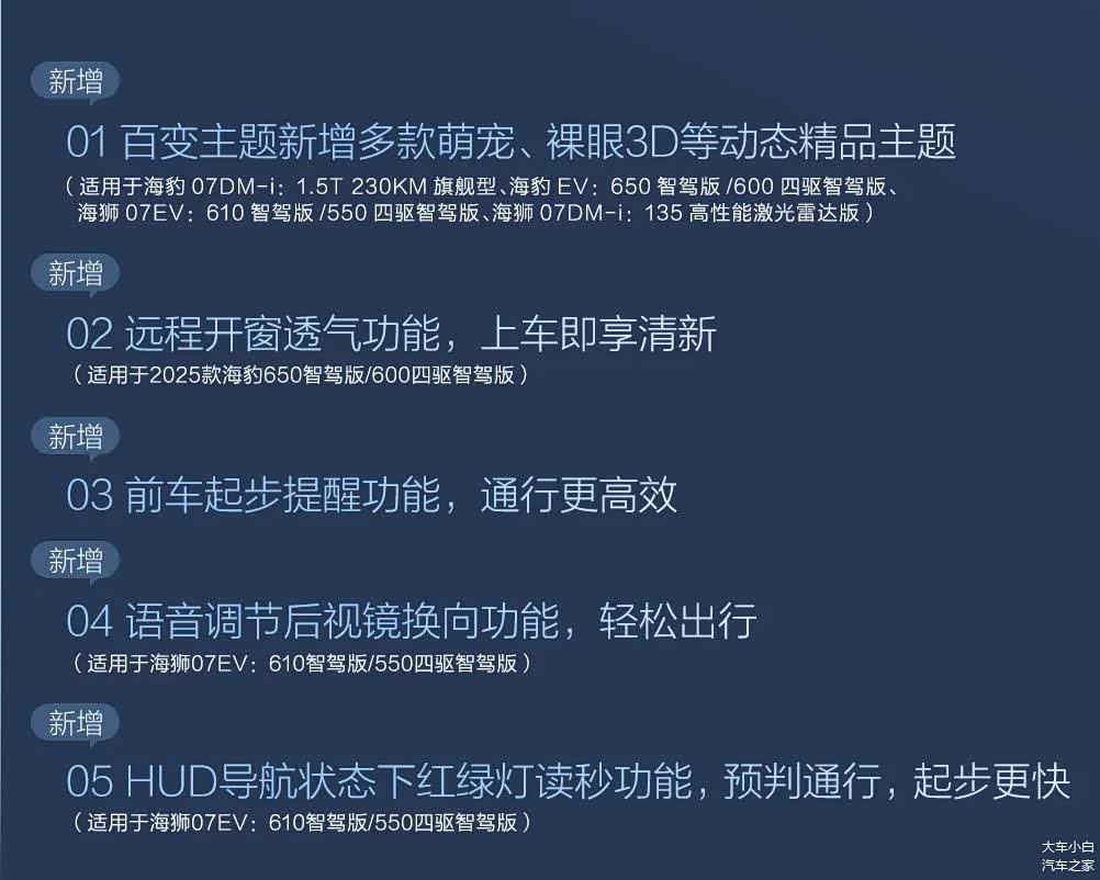 最后智能座舱, 交互体验全方位优化。 新增3D车模控制:通过中控屏3D车模,可直观控制车门、车窗、后备箱等。小迪智能助手升级:优化可见即可说、连续对话能力。 导航体验增强:新增导航红绿灯倒计时、沉浸式导航提示。