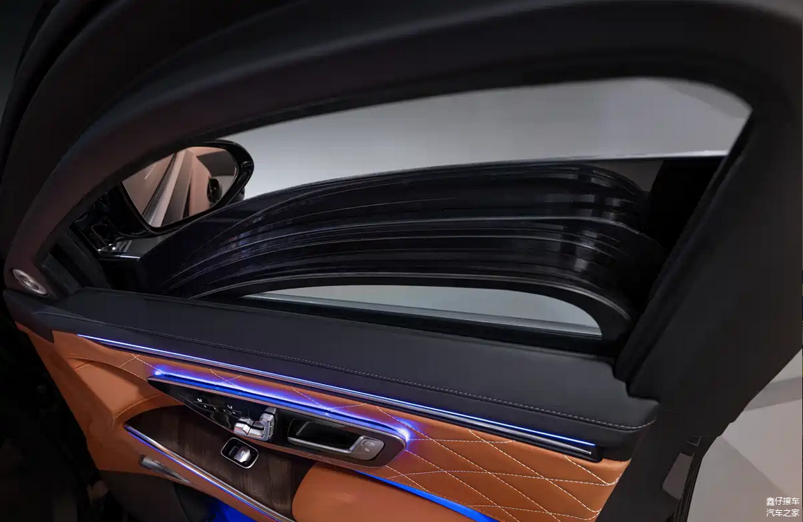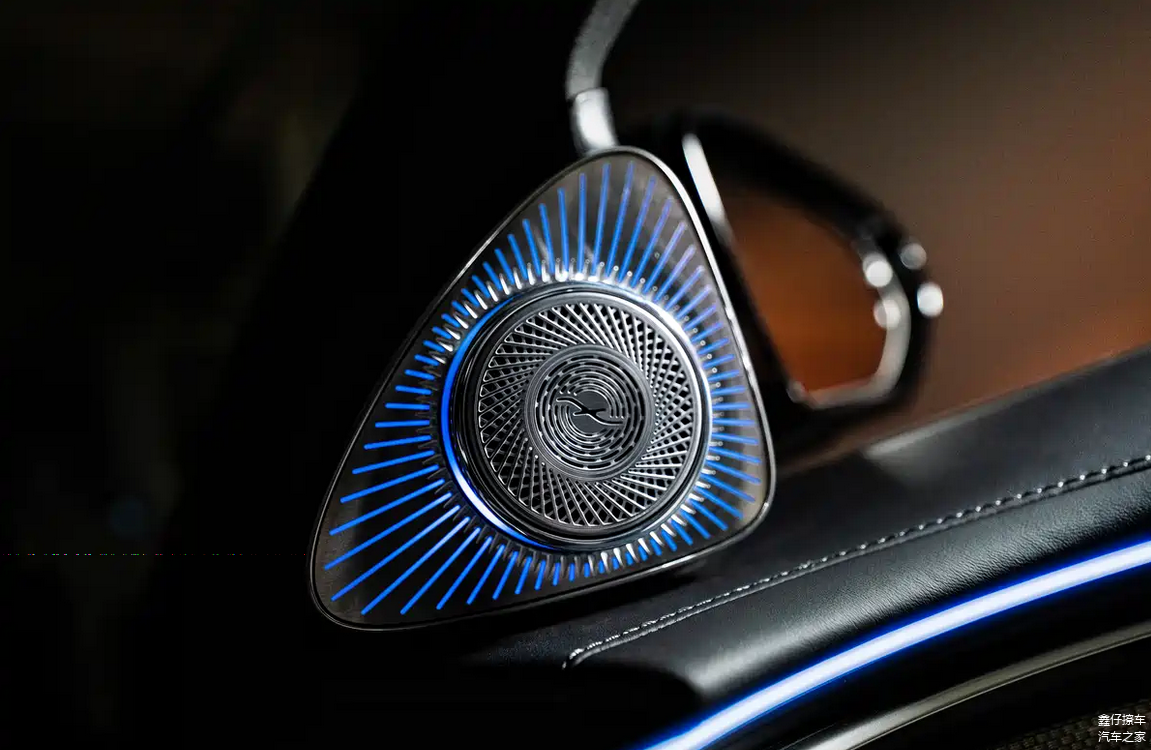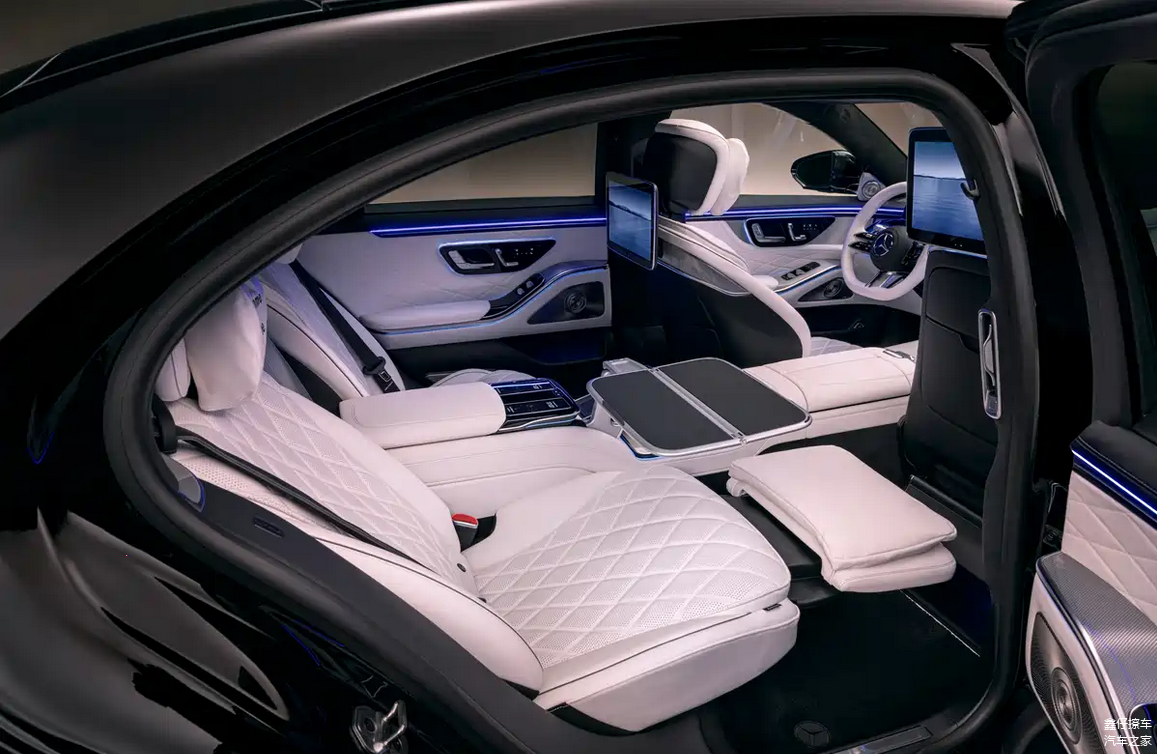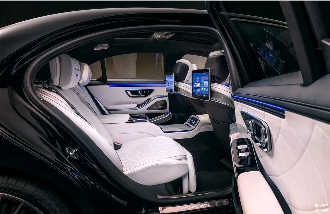 长轴距版本提供四座布局,后排“头等舱座椅”支持最大43.5度靠背调节与50度腿托角度。中央扶手区域集成无线充电、冷藏箱、可控温杯架与储物空间,13.1英寸后排显示屏配合可拆卸MBUX遥控器,满足多场景使用需求。音响系统提供Burmester 3D或支持杜比全景声的Burmester 4D系统,最多可布置39个扬声器,强调沉浸式体验。