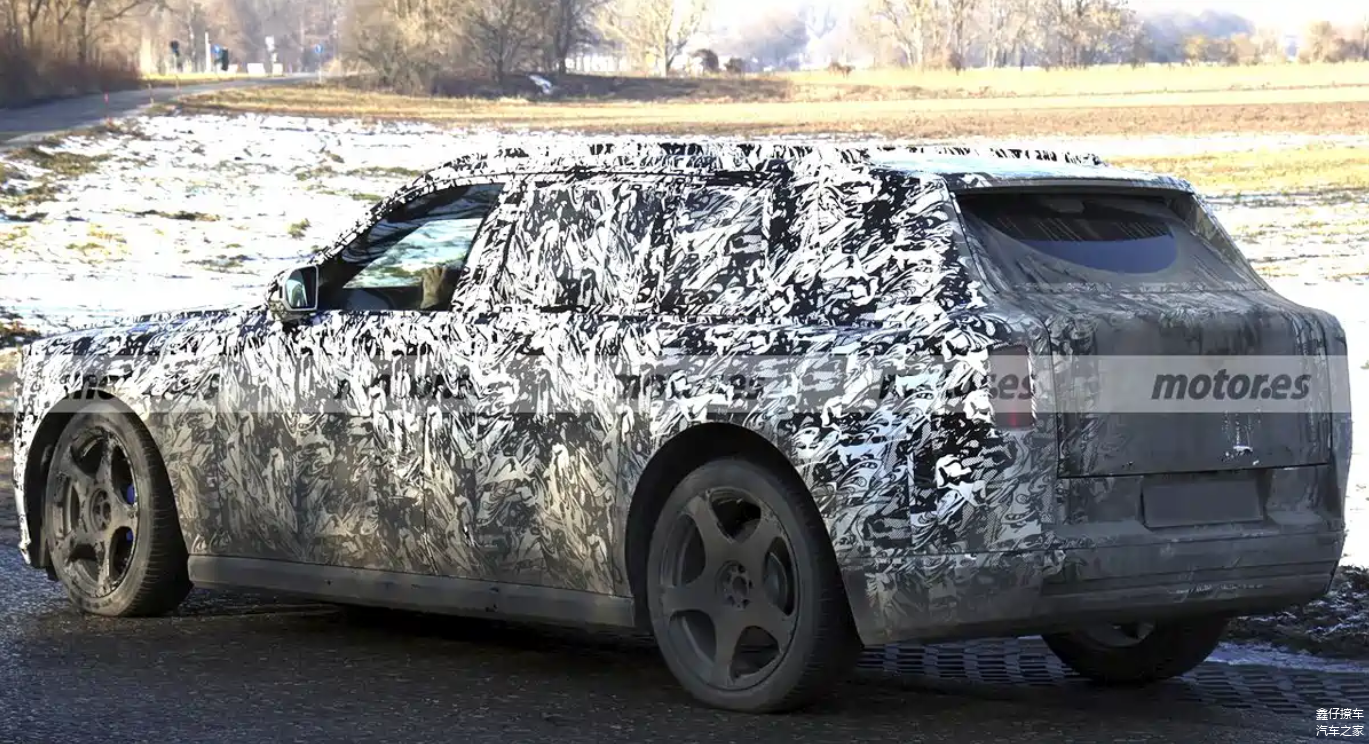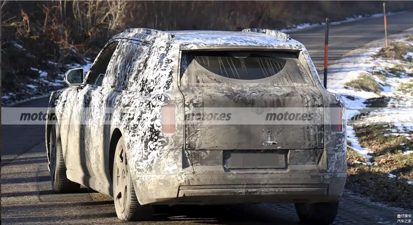侧面造型依旧是典型的劳斯莱斯风格,高腰线、直立D柱和近乎垂直的车窗轮廓,强调的是座舱内部的空间感,而非运动取向。纯电平台的优势在这里得到放大,地板高度可控,车内纵向空间和后排头部余量预计仍是核心卖点。从测试车轮圈尺寸判断,新车依旧会提供大尺寸轮圈方案,以匹配整车体量,同时兼顾行驶稳定性和静谧性需求,这也是劳斯莱斯SUV用户长期关注的重点。