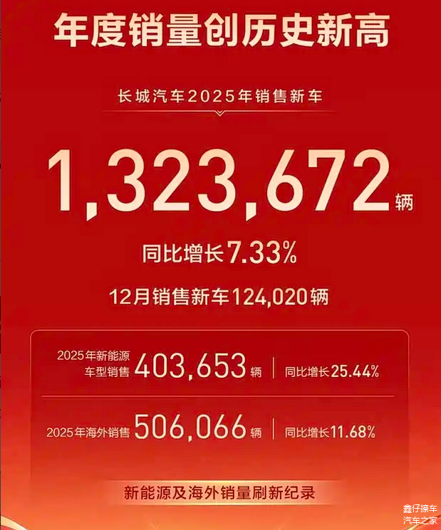 2025年长城汽车全年销量达到1323672辆,同比增长7.33%。在整体车市增速趋缓的环境中,这一增幅体现出较强的体系稳定性。值得注意的是,销量增长并未集中于单一品牌或单一市场,而是由多个板块共同贡献。传统燃油车型维持基本盘的同时,新能源车型和海外市场形成新的增量来源,使得整体销量结构更趋均衡,这种分散式增长有助于降低单一市场波动带来的风险。