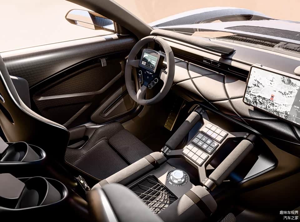 内饰以功能性与安全性为核心,兼顾越野实用性与驾乘舒适性。座舱配备轻量化桶形座椅,车门采用碳纤维材质,中控台辅以菱格纹皮革包裹,车内遍布翻毛皮扶手拉手,适配越野操控需求。仪表盘集成于方向盘之上,搭配可滑动中控屏,可在驾驶模式与领航模式间切换,满足双人协作越野需求。配置层面,新车针对性强化越野与安全性能,提供一体式防滚架、四点式安全带以及经过强化的车身结构组件,为极端越野工况提供全方位安全兜底。