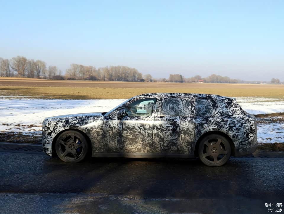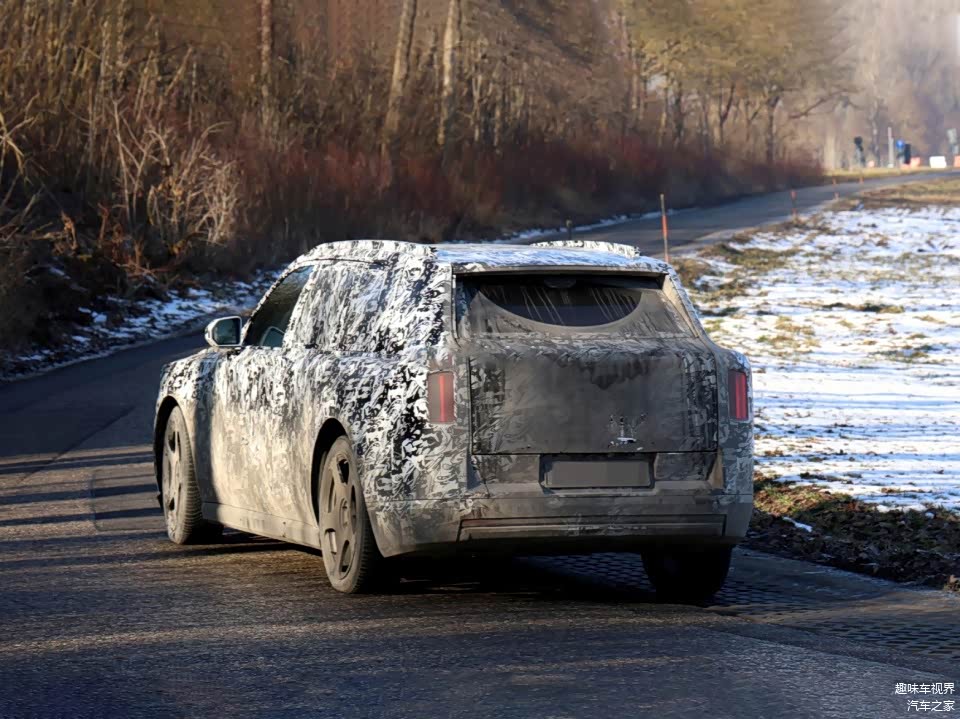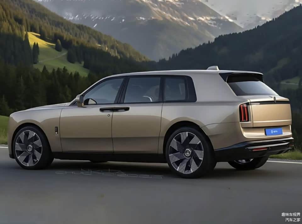 车身侧面依旧保持舒展的平直线条,沿用品牌标志性的对开门设计,搭配隐藏式门把手与粗壮的D柱,兼顾优雅气质与车身刚性,尺寸参考现款库里南,长宽高或接近5341/2000/1837毫米,轴距可达3295毫米,保障充裕的车内空间。车尾设计简洁硬朗,两侧尾灯依然保持纵向布局,搭配下移的牌照架与隐藏式排气(贴合纯电身份),整体层次感十足,车顶延伸出的扰流板则优化了高速行驶稳定性。
