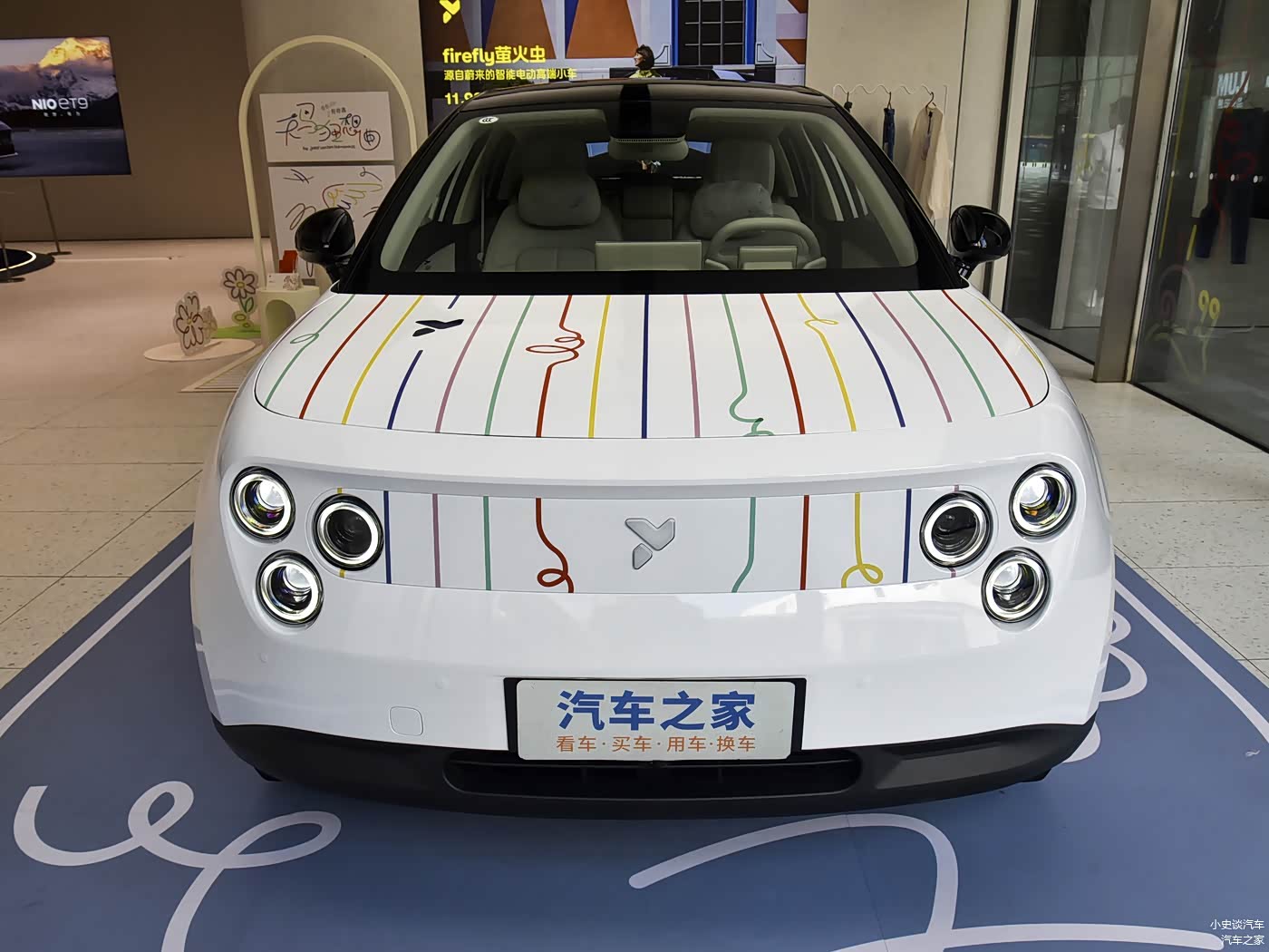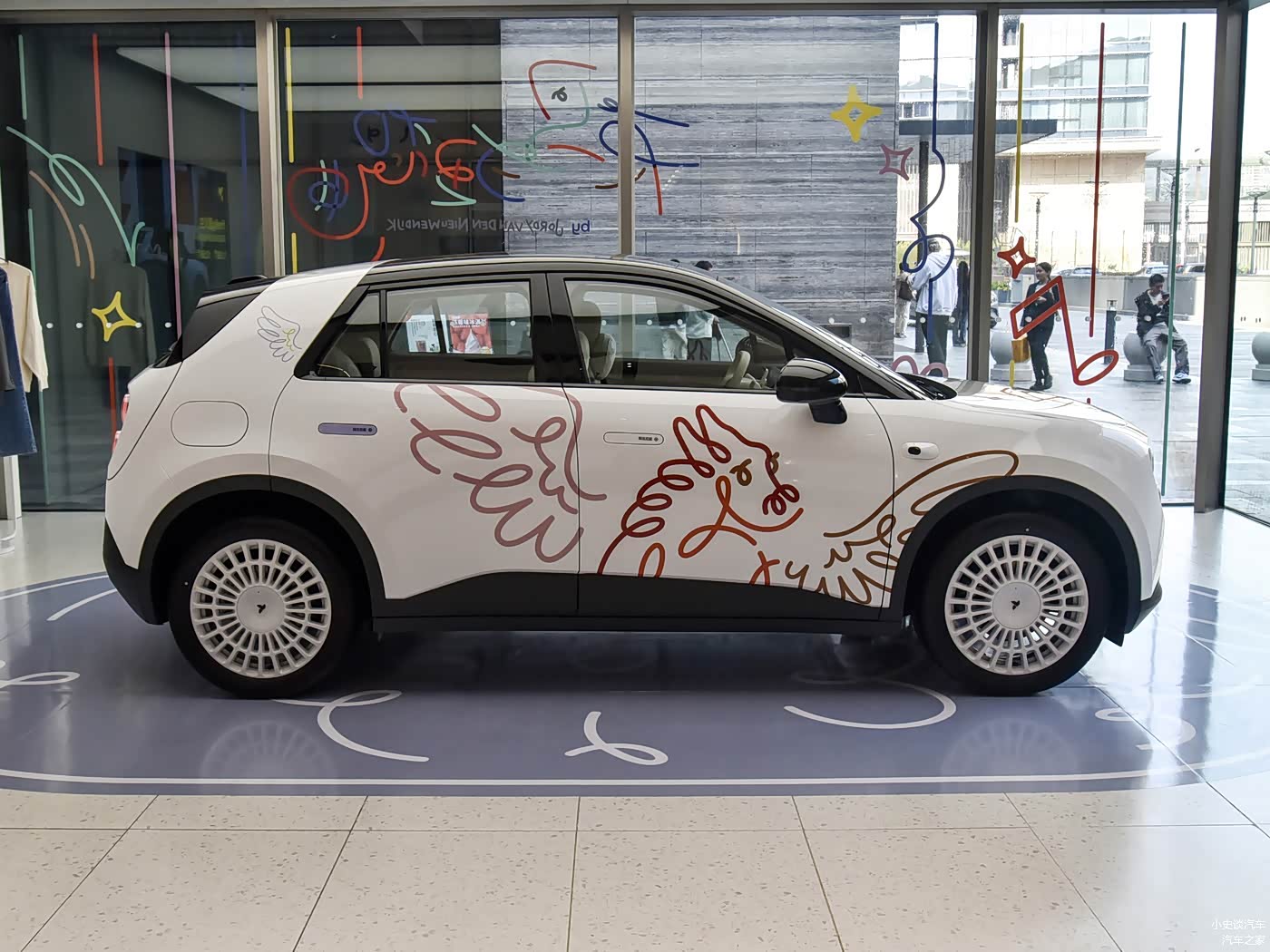 我们首先来看新车的外观设计方面,车头设计以封闭式格栅为基础,搭配官方命名为“三重奏”的LED大灯组,每侧由三个圆形大灯组成,点亮后辨识度极高,仿佛夜幕下的舞台聚光灯。前舱盖、车侧和车顶点缀着多彩线条的手绘风格拉花,核心视觉元素是带翅膀的天马,线条灵动流畅,色彩渐变自然,同时巧妙融入蜗牛、繁花等意象,与天马形象呼应,勾勒出烂漫随性的视觉氛围。前翼子板处印有艺术家亲笔签名标识,进一步强化了专属身份与收藏属性。