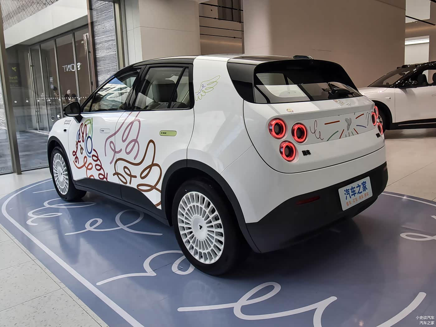 再来看车尾部分,车尾设计同样充满艺术气息,LOGO周围的礼花图案增添了灵动气息,与车头设计形成完美呼应。尾灯组造型独特,点亮后具有极高的辨识度。后包围设计简洁而富有层次感,与车身整体风格保持一致。车尾的拉花设计进一步强化了整车的艺术氛围,使其在道路上行驶时成为一道亮丽的风景线。