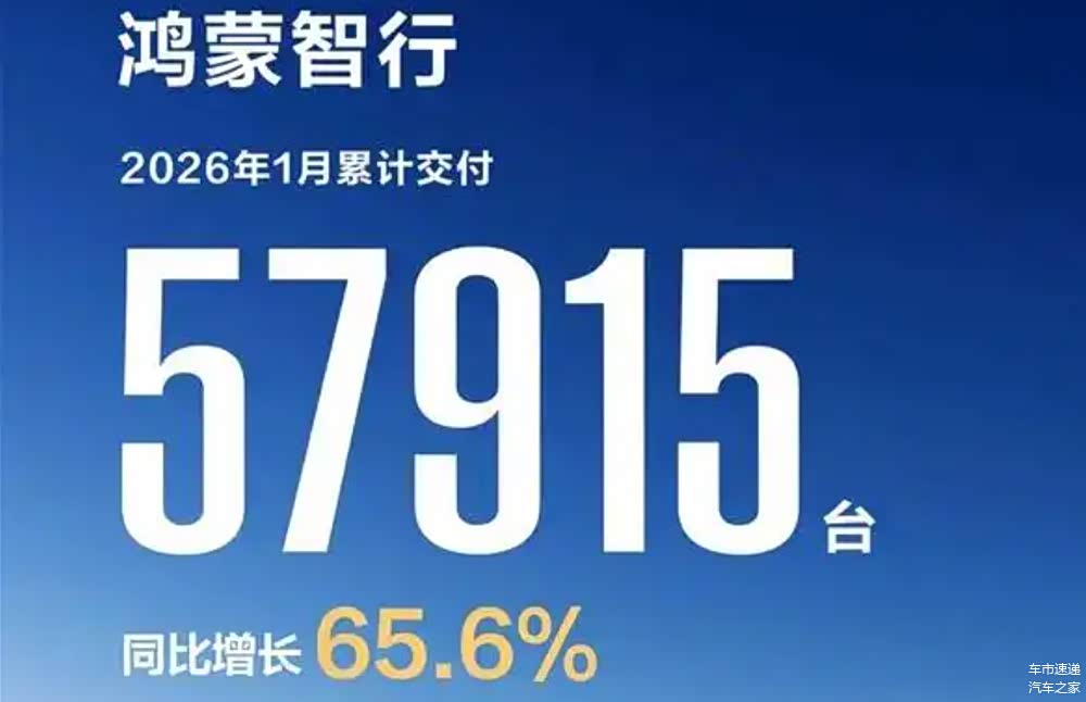 鸿蒙智行2026开年首月销量为57915辆,同比增长65.6%。相比去年12月销量来看,环比下滑达到35%。