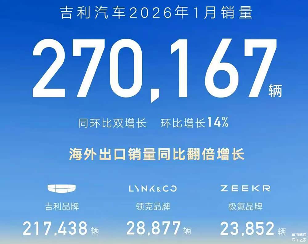 根据吉利汽车集团公布的销售数据显示,2026年1月份吉利集团总销量达到270167台,实现了同比环比双增长,其中,新能源汽车月销124252台,同比增长3%;海外出口销量60506台,同比激增121%,环比增长50%。