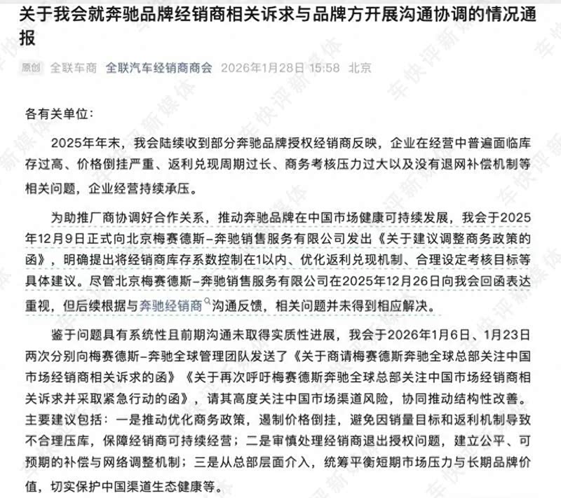 在收到反映后,经销商商会在2025年12月9日已经向奔驰销售服务有限公司发出了《关于建议调整商务政策的函》,明确提出将经销商库存系数控制在1以内以及优化返利兑现机制和合理设定考核目标等具体建议。