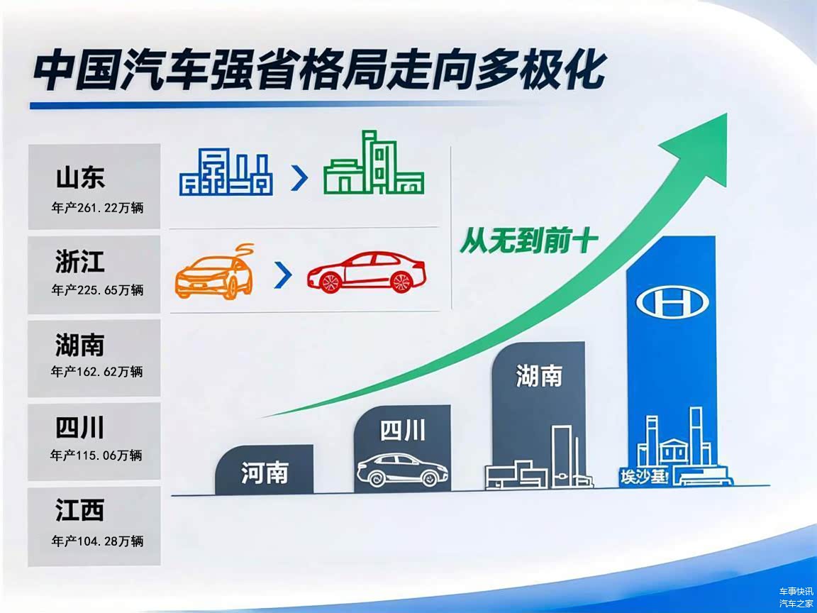 新兴力量的集体进位,更让中国汽车强省格局走向多极化。山东、浙江首次跨过200万辆门槛,分别以261.22万辆、225.65万辆跻身前五,山东依托比亚迪济南基地与中国重汽新能源重卡实现突破,浙江则凭借吉利、零跑等品牌稳步增长。湖南堪称最大黑马,从2024年未进前十,一跃升至第九位,核心得益于比亚迪长沙基地、埃安长沙工厂的协同发力。此外,河南、四川、江西等省份也突破百万辆,凭借头部车企产能落地,成为产业格局中的新势力。