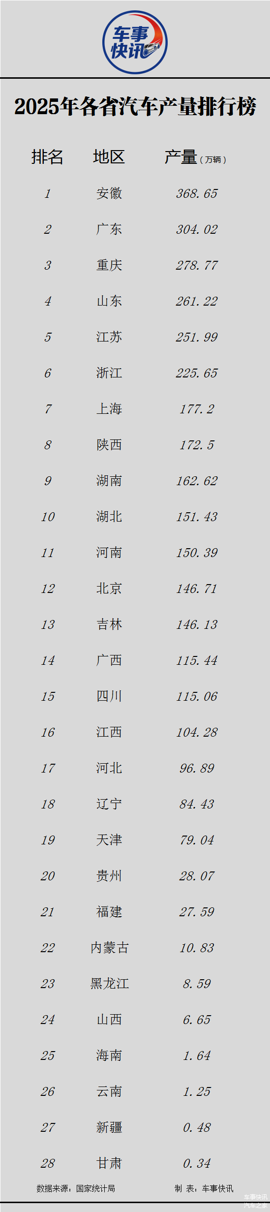 先上一组核心数据,直观感受洗牌力度。2025年国家统计局数据显示,全国已有16个省份汽车产量突破百万辆,前十排名彻底改写:安徽以368.65万辆登顶,广东以304.02万辆退居第二,重庆、山东、江苏紧随其后,而中国汽车工业发源地吉林,以146.13万辆跌至第13位,正式退出十强。更关键的是,前十省份差距持续缩小,未来任一超级工厂的投产或减产,都可能改写排名格局。