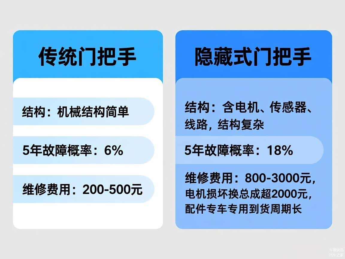 除此之外,故障概率高、维修成本贵,也是车主吐槽的重灾区。隐藏式门把手依赖电机、传感器、线路等电子元件,结构比传统机械门把手复杂得多,实测数据显示,它的5年故障概率达18%,是传统门把手(6%)的3倍,常见故障包括按键失灵、弹出卡顿、电机损坏。更坑的是维修成本:传统门把手维修只需200-500元,而隐藏式门把手单次维修费用高达800-3000元,若是电机损坏需要更换总成,费用甚至超过2000元,且配件多为专车专用,到货周期长,严重影响用车体验。