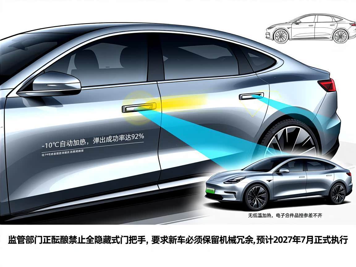 但现实是,很多15-25万的家用车,本身定位是刚需代步,却强行加装隐藏式门把手,既没有低温加热功能,电子元件的品控也参差不齐,反而让“高级感”变成了“槽点”。更值得注意的是,监管部门已经开始出手整顿这种“重噱头轻实用”的乱象,目前正酝酿禁止全隐藏式门把手,要求新车必须保留机械冗余,预计2027年7月正式执行,不少车企(比如新款问界M7、极氪9X)已经开始调整设计,回归半隐藏或传统门把手造型。