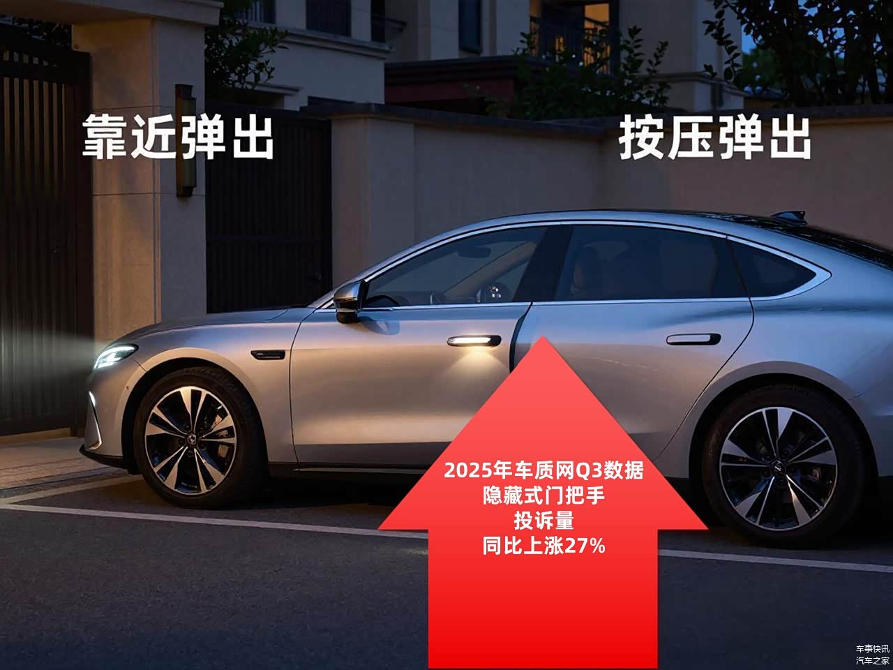 第二,科技仪式感?新鲜感过后全是麻烦。不可否认,第一次用隐藏式门把手,“靠近弹出”“按压弹出”的动作确实很酷,尤其是带灯光迎宾的版本,很容易让人觉得“高级”。但新鲜感褪去后,全是实用性的短板,这也是2025年车质网Q3数据显示“隐藏式门把手投诉量同比上涨27%”的核心原因。