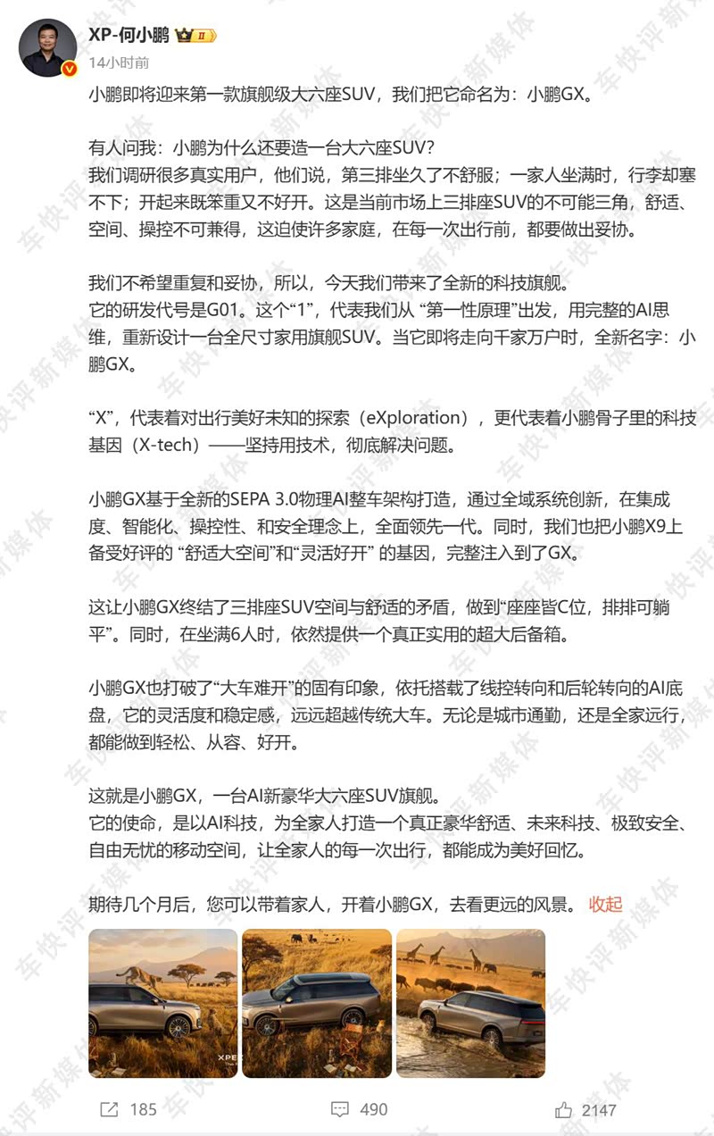 不过看起来,小鹏汽车董事长何小鹏好像是等不及了。因为就在2月5日,他在个人社交账号发布了旗舰大6座SUV的相关信息,新车将会命名为小鹏GX。