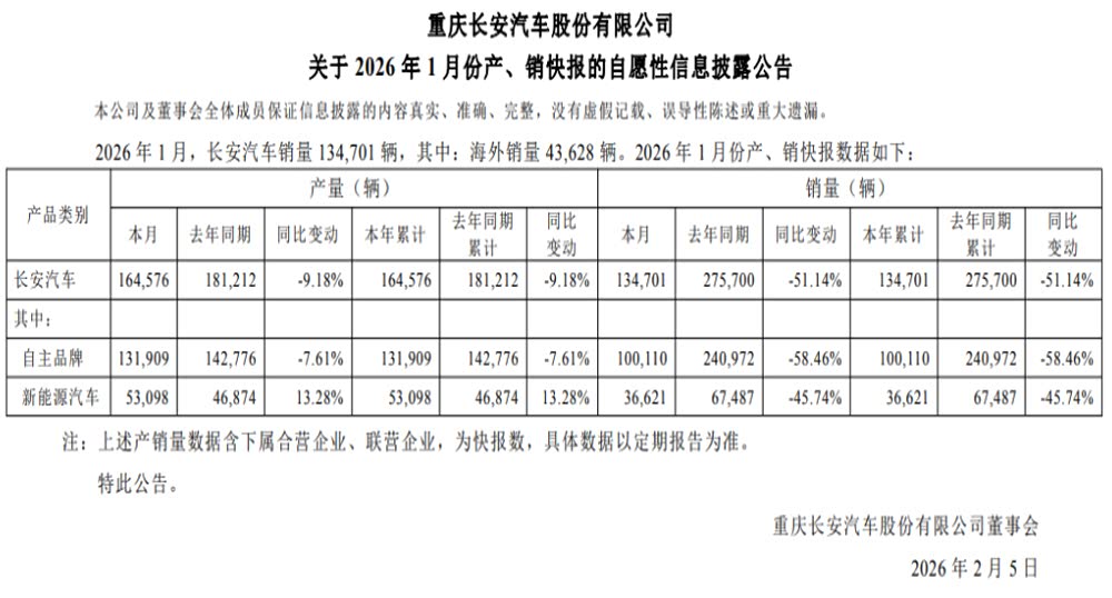 根据公开的产销快报显示,2026年1月份,长安汽车旗下自主品牌单月销量为100110台,同比下滑58.46%;新能源汽车单月销量为36621台,同比下滑45.74%。这就是长安汽车2026年开年首月的现状。