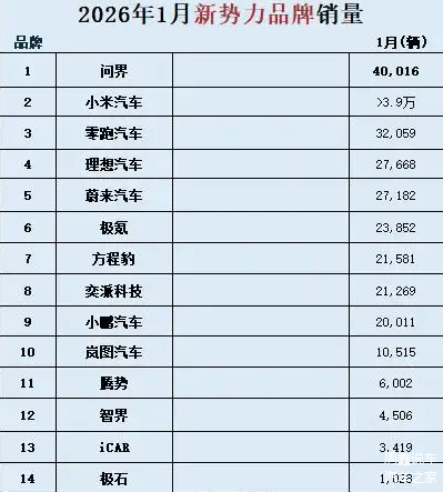 2026年1月,国内车市迎来了开年首月的传统淡季,叠加2025年底车企冲量透支需求和新能源汽车购置税补贴退坡等多重因素影响,新势力品牌销量呈现出“同比分化、环比普降”的表现。截至2月2日,各大新势力品牌陆续公布了销量数据,前十品牌座次迎来明显洗牌,接下来我们就来看看这些新势力品牌的表现吧。