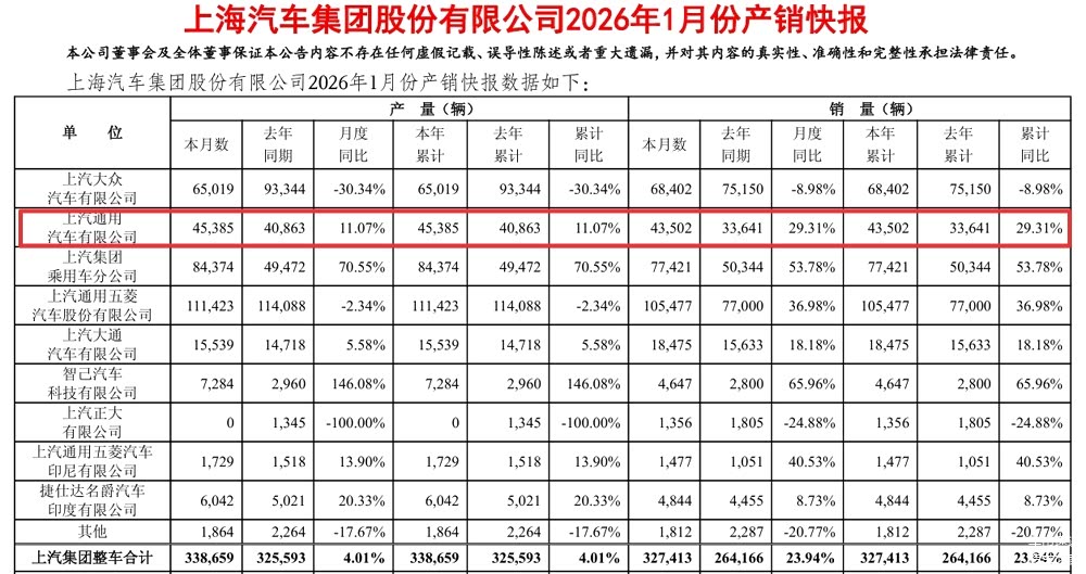 根据上汽集团公布的销售数据显示,2026年开年首月,上汽集团单月销量为327413台,同比增长23.94%,其中,上汽乘用车月销77421台,同比增长53.78%;上汽通用五菱月销超10万台,同比增长36.98%;上汽大众月销68402台,同比下滑8.98%。