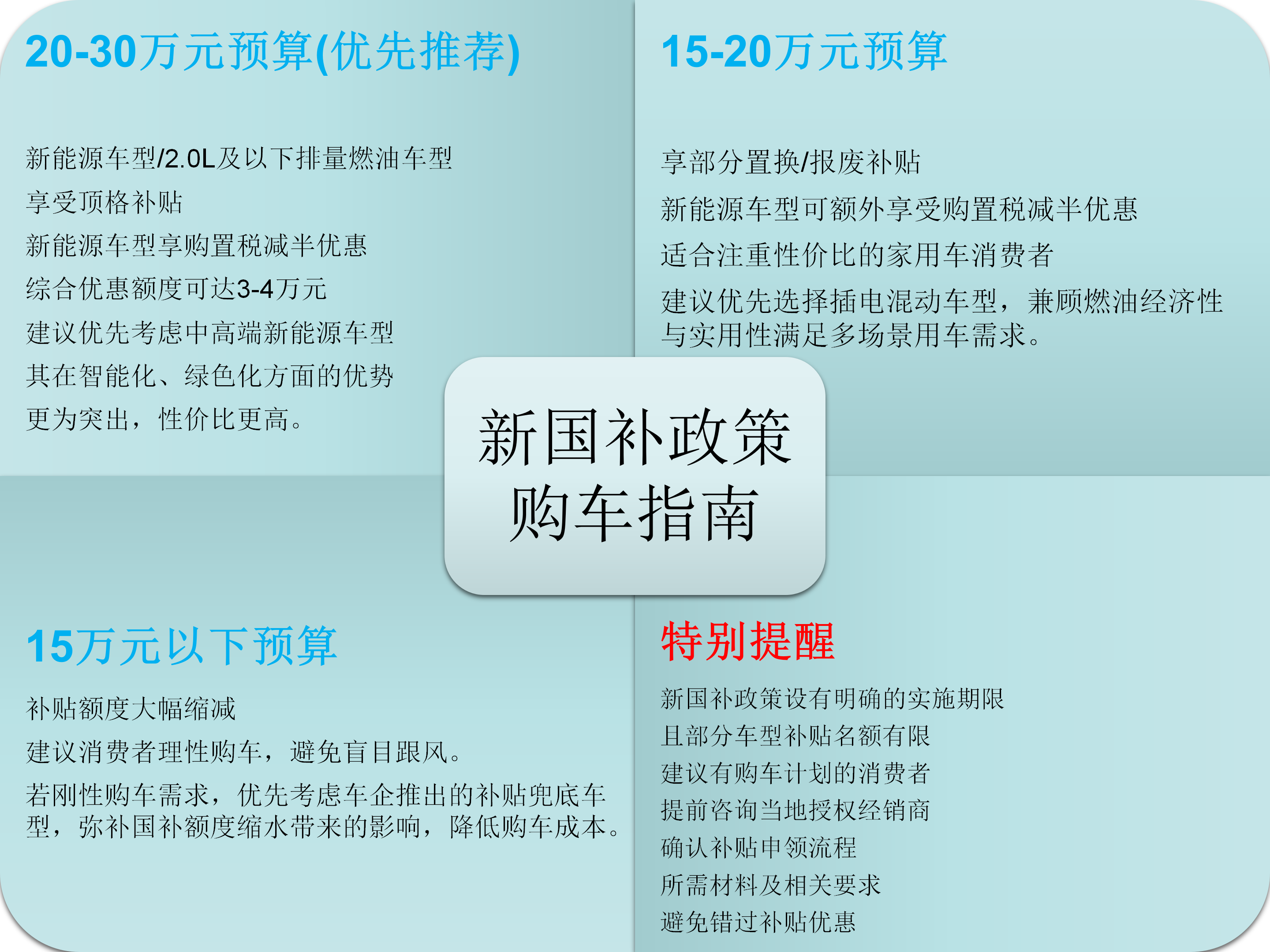 结合新国补核心政策、首月市场实施数据及行业深层逻辑,针对不同预算区间的消费者,整理了高效享受补贴优惠的专业建议,规避购车误区,帮助消费者实现利益最大化:
