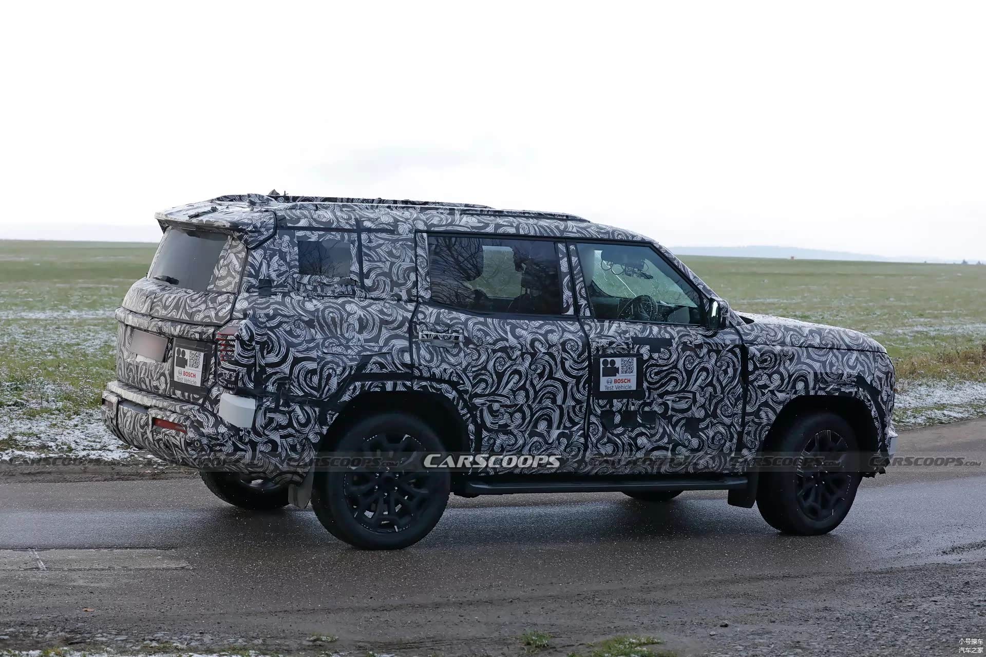 侧面造型方面,车顶线条比较平直,配备有粗壮的行李架,带来了比较强的硬派气息;从轮廓来看,车顶可能还营造出了悬浮式造型,但还不能完全确认;腰线能够看到分段式设计的痕迹,点缀出了车身侧面的层次感,同时也进一步增强了力量感;轮眉和侧裙部分设计有隆起的筋线,轮毂则是多幅式熏黑造型,整个车身看起来非常魁梧。
