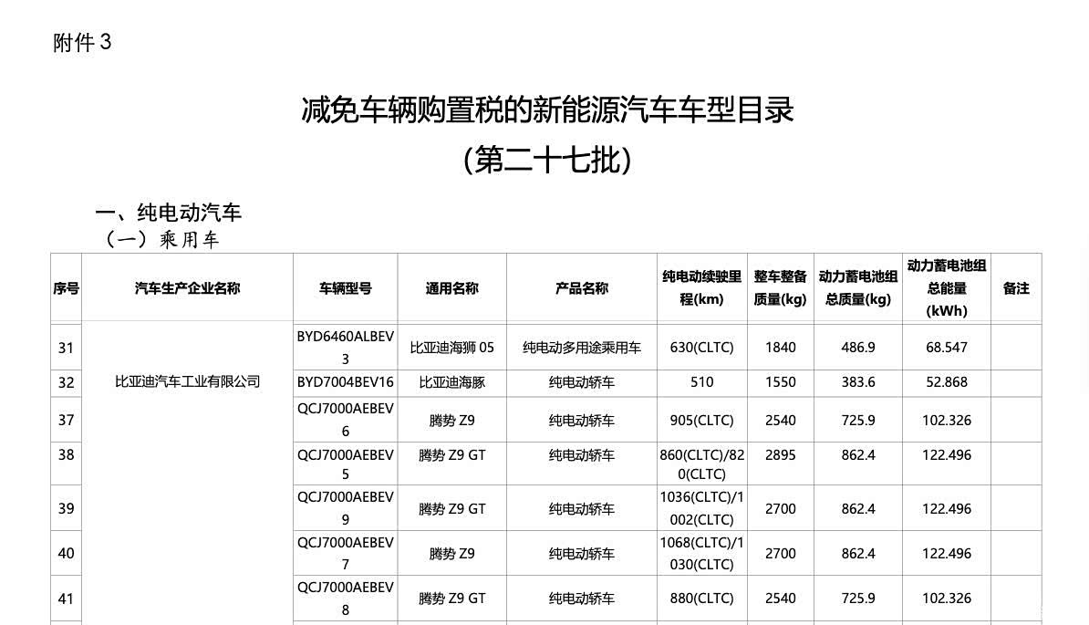 2月10日,我们在减免车辆购置税的新能源汽车车型目录中发现到了新款腾势Z9和新款腾势Z9GT车型申报信息,两款车型均换装了102.326kWh和122.496kWh电池组,纯电续航里程相比现款得到很大的提升。